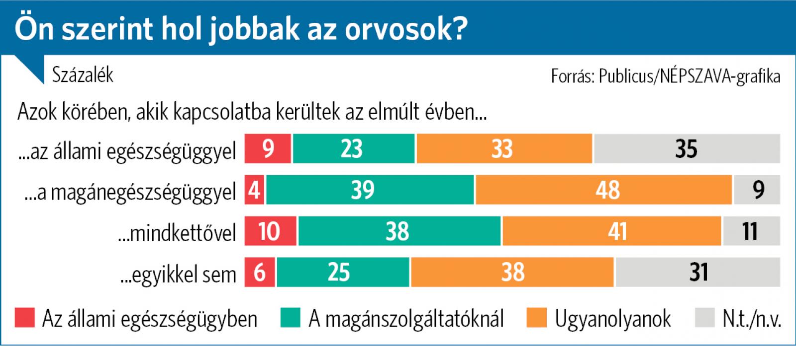 Hálapénz helyett várakozás – A magánszférában pótolják kiesett jövedelmüket az orvosok, ezért sincs elég szakember az állami rendszerbenHat-hét évet szenved egy átlagos magyar beteg, mire a diagnózistól eljut egy térdprotézis-műtétig, amelyre orvos helyett doktor Google készíti felE kutatás különös értéke, hogy arra is rávilágít, miként függ össze a személyes tapasztalatokkal a két nagy szektor orvosainak szakmai megítélése. Az még nem igazán meglepő, hogy azok, akik az állami egészségüggyel kerültek kapcsolatba, az átlagosnál nagyobb arányban ítélik jobbnak az ottani orvosokat, s ennek tükörképét mutatja a magánszolgáltatók pácienseinek a véleménye. Ez lehet egyfajta önigazolás eredménye is. Az már figyelemre méltóbb, hogy az utóbbiak között sokkal elterjedtebb az a meggyőződés, miszerint az orvosok itt is ott is ugyanolyanok (48 százalék) szemben az állam betegei közötti 33 százalékkal) A legmeglepőbb mégis talán az, hogy az állami orvosok az összevetésben a legjobb értékelést azoktól kapták, akik az elmúlt évben mindkét szektorban szereztek tapasztalatokat: az ő 10 százalékuk a közszolgáló doktorokat látta profibbnak. A kutatás szolgált egy igazán paradox eredménnyel is. Az általános, azaz az „össztársadalmi vélekedés” megoszlását ugyanis legpontosabban azok véleménye tükrözte, akik sem állami, sem magánegészségügyi szolgáltatóval nem kerültek kapcsolatba a közelmúltban.