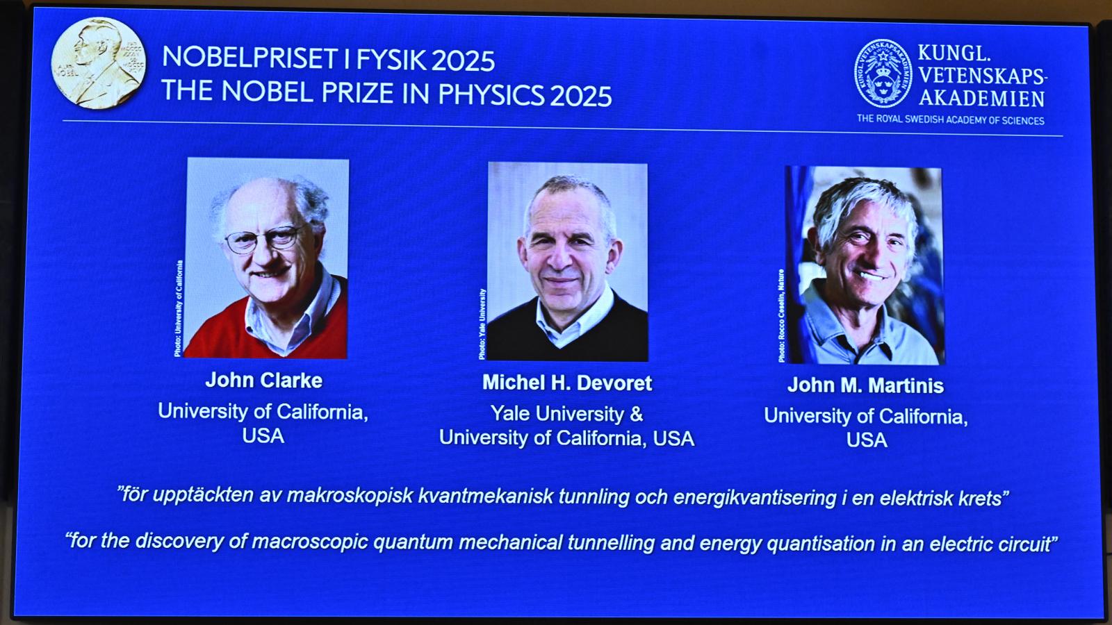 A tegnap délelőtt átadott fizikai Nobel-díjat is hárman kapták, az indoklás szerint azért, mert John Clarke, Michel H. Devore és John M. Martinis kísérletek sorozatával a kvantumfizika bizarr jelenségeit egy konkrét, emberi kézben is elférő szuper-vezetőképességű elektromos készüléken mutatta be. Azt is demonstrálták, hogy a rendszer a kvantummechanika által megjósolt csomagokban - kvantumokban - nyel el és bocsát ki energiát.