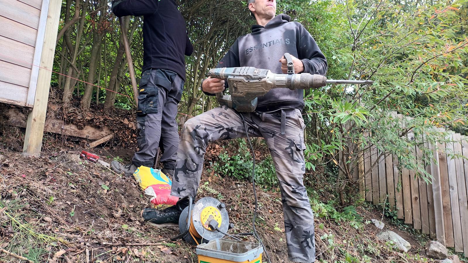 Azért sem vagyok meglepődve, mert éppen kerítést építünk, egy család hátsó kertjébe Edinburgh-ban, és amekkora pechünk volt, az egyik oszlop helye pont arra a területre esik, ahol láthatóan nagy a jövés-menés , egy föld alatti lyukból repkednek ki és be a darazsak. Már az elején mondtam a többieknek, hogy nem lesz ez jó, de nem vettek komolyan. Valamit ki kell találni. A szabályosan megépített kerítés oszlopainak távját hiába növeljük, akkor is ki fognak jönni a darazsak, hiszen a föld püfölése, ásása és kiemelése nagy lökéshullámokat gerjeszt a mélyben, és ez őket igencsak bosszantja. Nézem a nagy dög légkalapácsot a kezemben, ezzel kellene a régebbi oszlopok beton aljzatát vészverni, illetve a földben lévő nagy sziklákat szétrepeszteni. A szabályos lyuk 65 cm mély, és olyan széles, hogy elférjen benne oszlop és körbe ölelhesse a beton, amely stabilan tartja majd a jövőben.