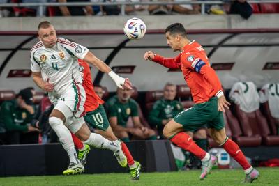A kapott gól sem törte meg a magyarok lelkesedését, ugyanúgy bátran vezettek támadásokat, melyek végén Szoboszlainak és Vargának is volt lövőhelyzete. Ez a játék alkalmanként megnyitotta a területet a portugáloknak is, de a magyarok az első játékrészben rendre időben visszaértek annak köszönhetően, hogy a hátul maradó védők megnyerték az egy az egy elleni párharcokat. Ennek ellenére közvetlenül a szünet előtt Ronaldo második zicceréből is betalált. Ekkor, vagyis a 45+3. percben Mendes ívelt középre balról, Orbán fölött átszállt a labda, Ronaldóval pedig ezúttal sem érkezett senki, így 5 méterről szabadon lőhetett a magyar kapuba.