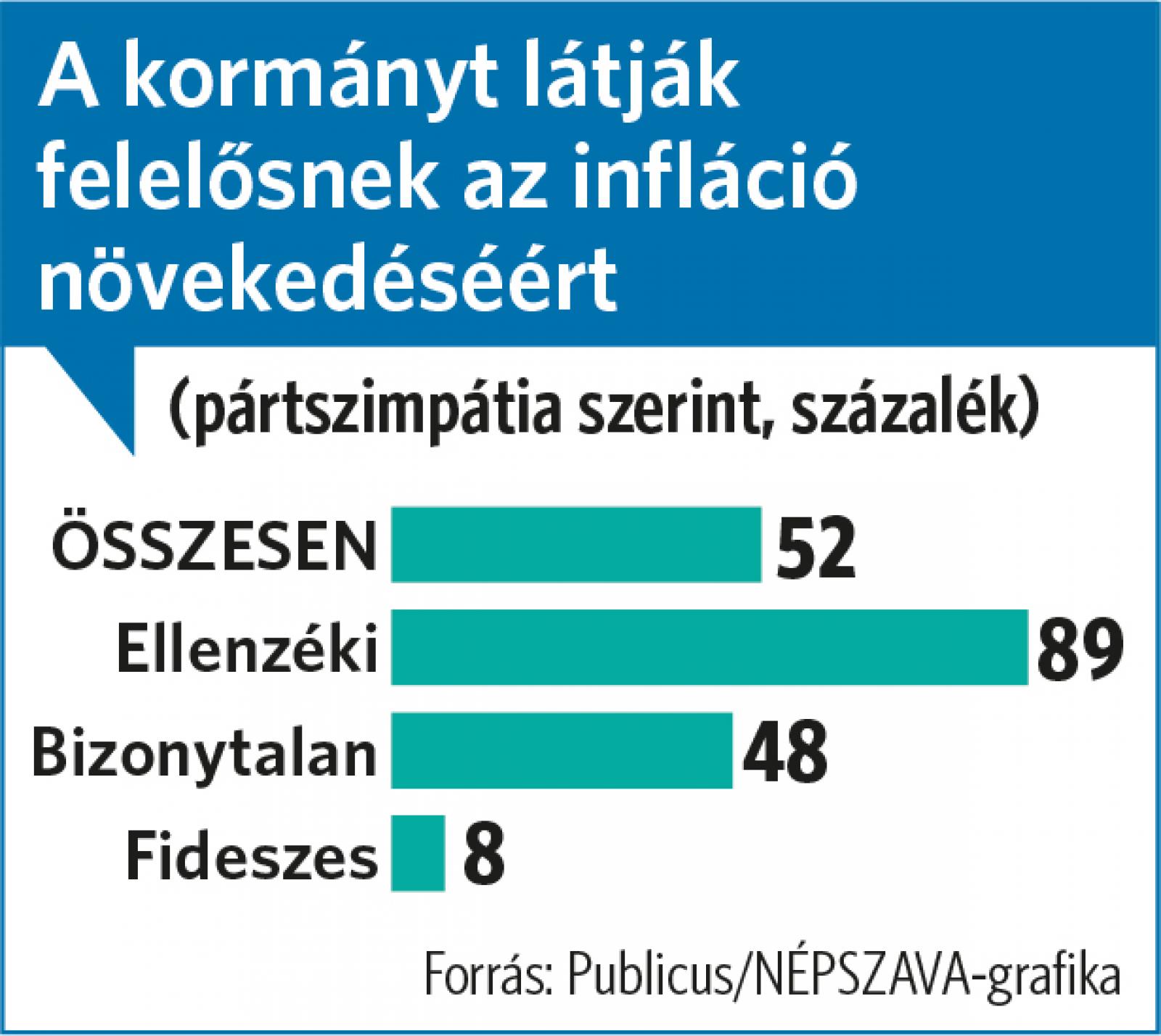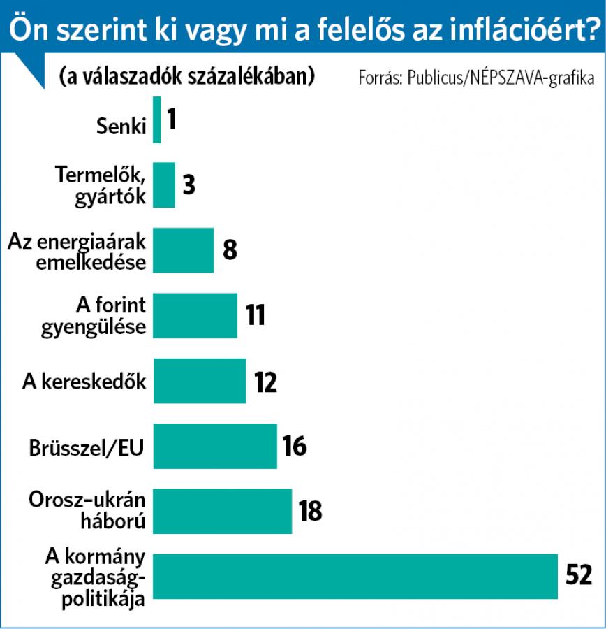 A magyarok 52 százaléka elsősorban a kormányt, a Fideszt vagy éppenséggel Orbán Viktor gazdaságpolitikáját okolja az infláció növekedéséért – olvasható ki a Publicus Népszava kérésére készített felméréséből. (A kutatás október 6-13 között készült, telefonos felvétellel, a minta reprezentatív a magyar felnőtt népesség egészére.) Ezen túl még az ukrajnai háborút okolta a válaszadók 18 százaléka, 16 százalékuk szerint pedig az EU is felelős a magas árakért, de csak 12 százalék nevezte meg a kereskedőket, míg a (gyenge) forintárfolyamot a válaszadók 11 százaléka említette.