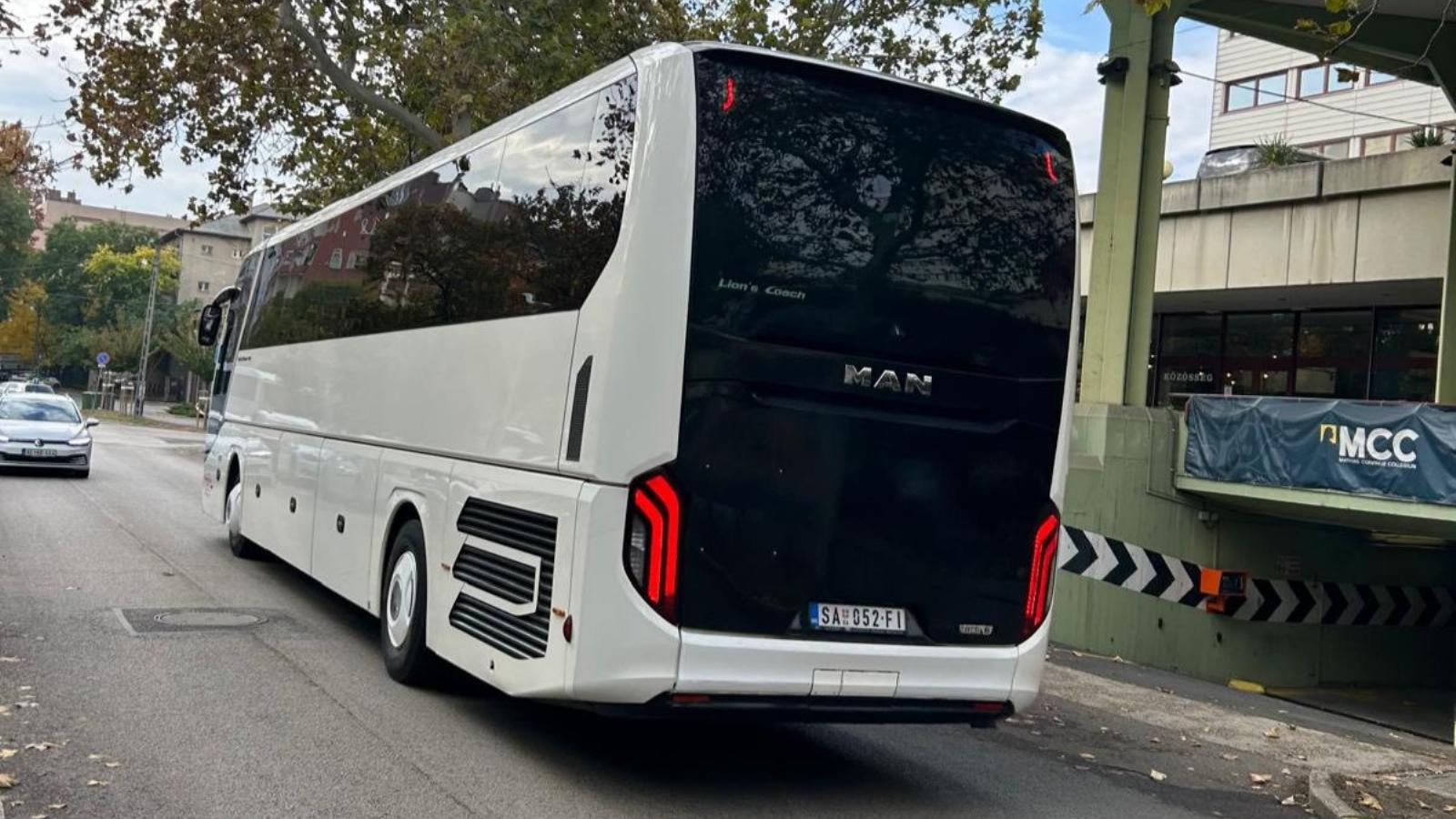 Filmvetítésre érkező diákok busza parkolt az MCC épülete előtt