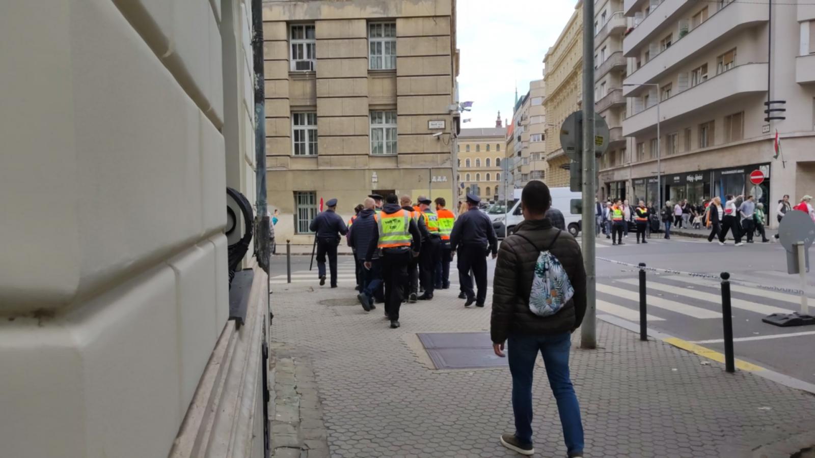 A Szalay utcában valtonos kísérettel rendőrök vezettek ki valakit a Békemenetről. Amikor helyszíni tudósítónk közelebb akart menni érdeklődni, hogy mi történt, egy valtonos határozottan odébb tessékelte, és kérte, hogy tegye el a kamerát. Ezután néhány Kossuth téren álló valtonosból annyit azért sikerült kiszednie, hogy az illetőt a tömegből emelték ki.