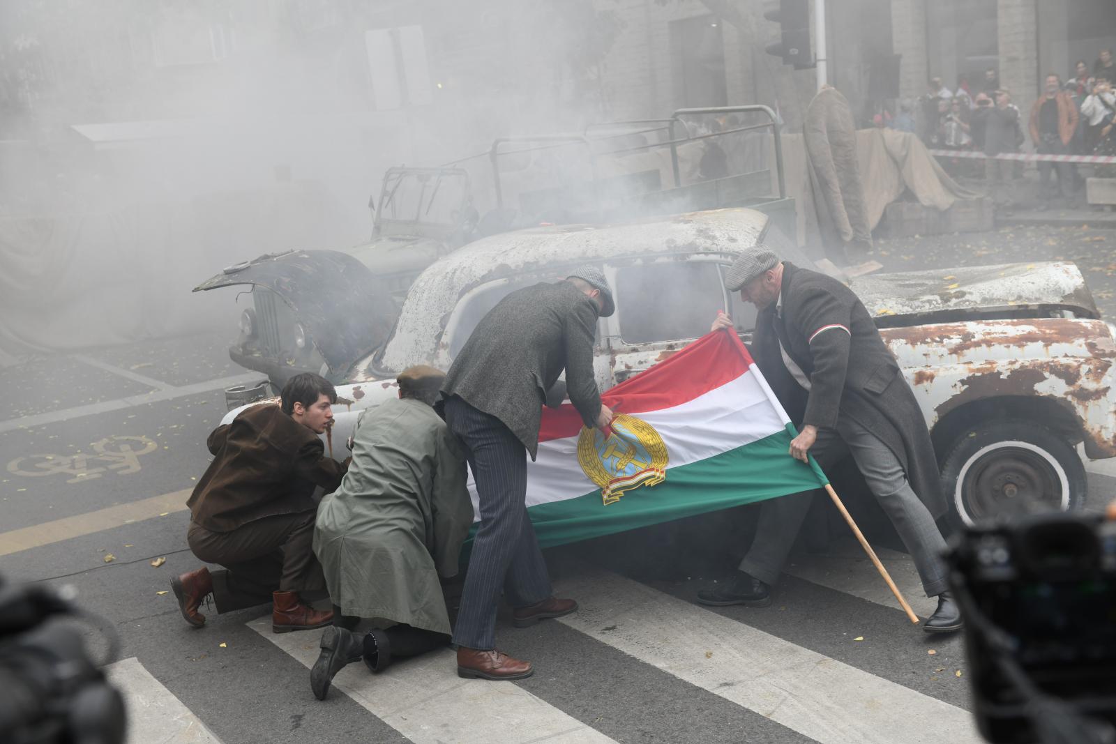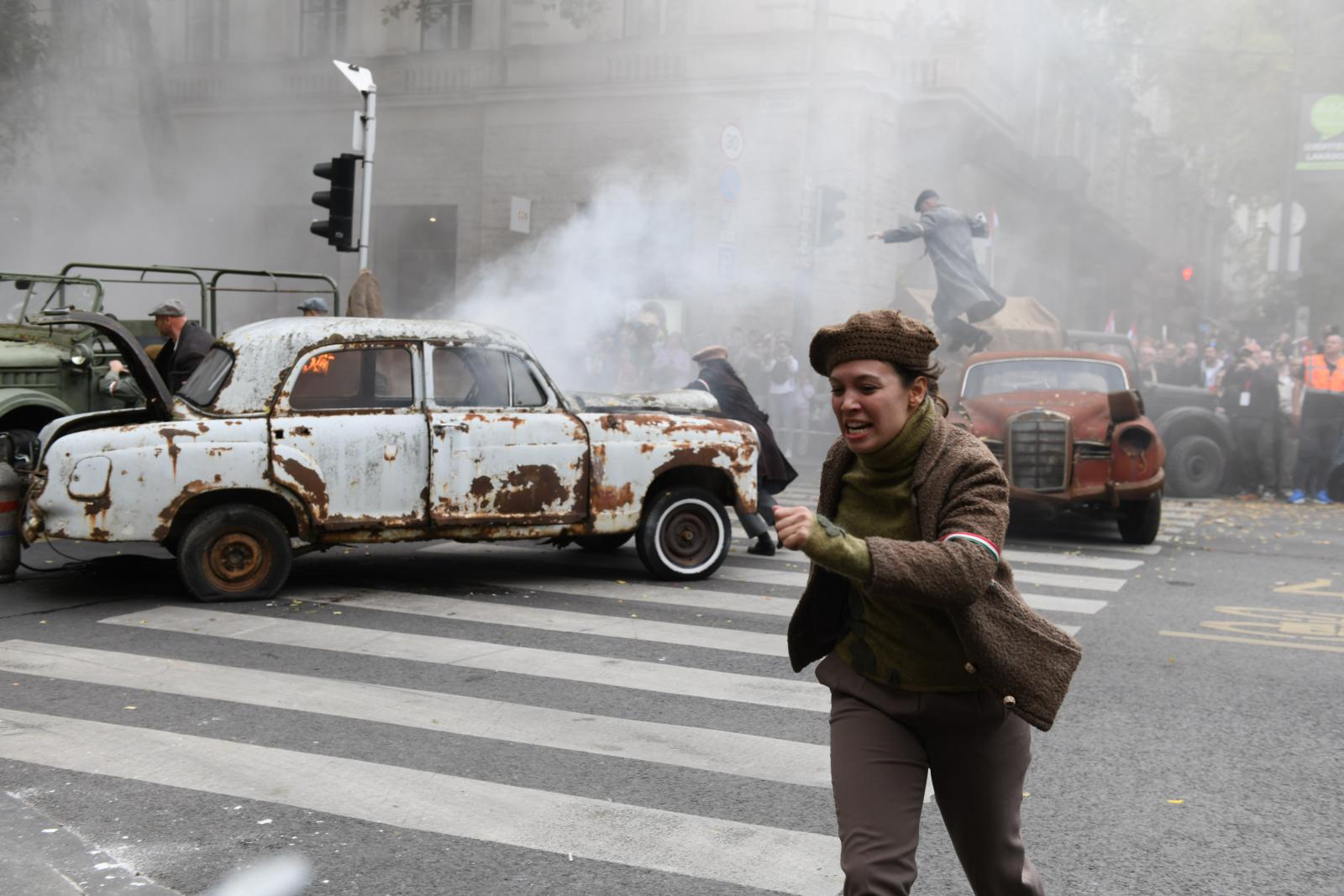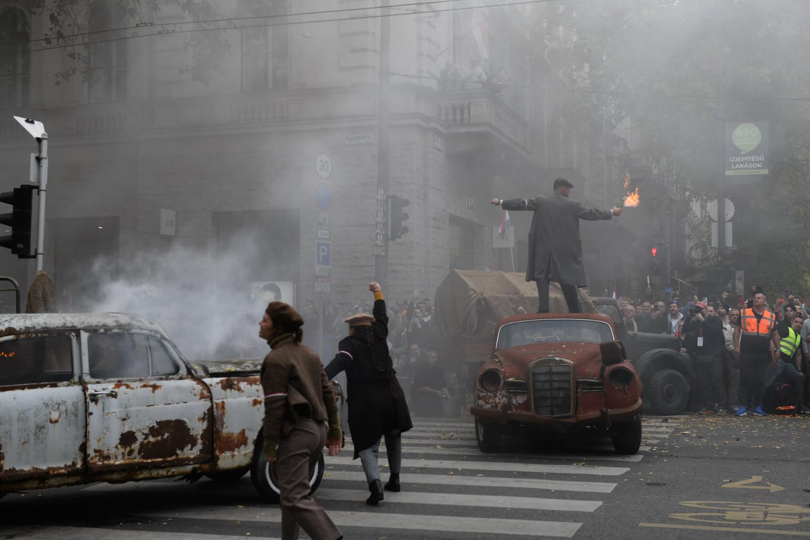 A Nemzeti Menet útját installációk szegélyezik, ugyanúgy, mint tavaly. Ez Radnai Márk, a Tisza Párt alelnöke, színházi rendező kézjegye. A Nagymező utca és az Andrássy út sarkán égő autóroncsokat lehet látni, füstgép is van, egy performansz keretében a statiszták rohamot indítanak a szovjet egységek ellen. Kicsivel később egy férfi egy kisebb emelvényen élőben zongorázza a Tavaszi szél...-t.