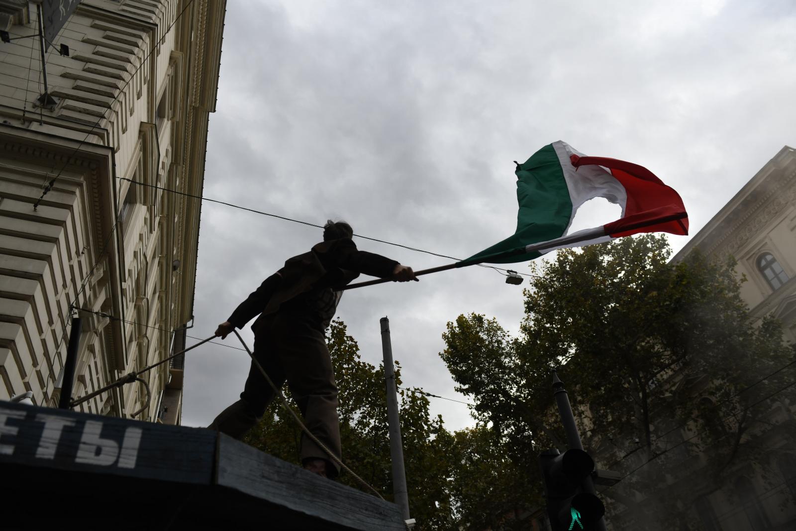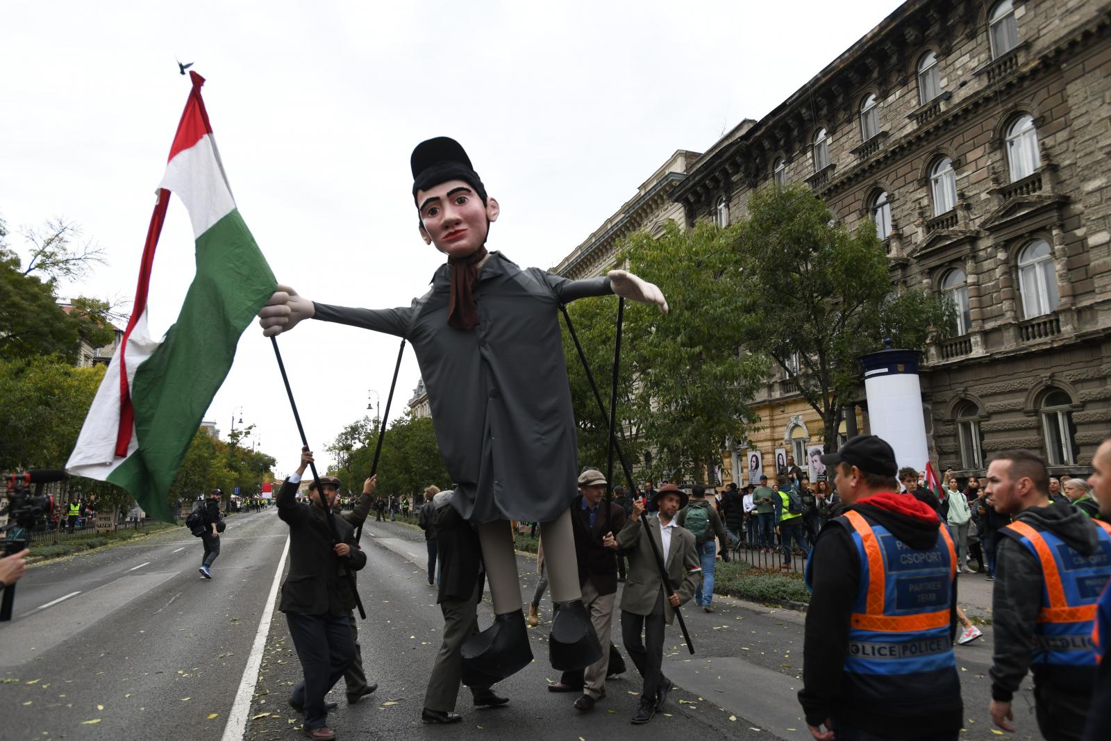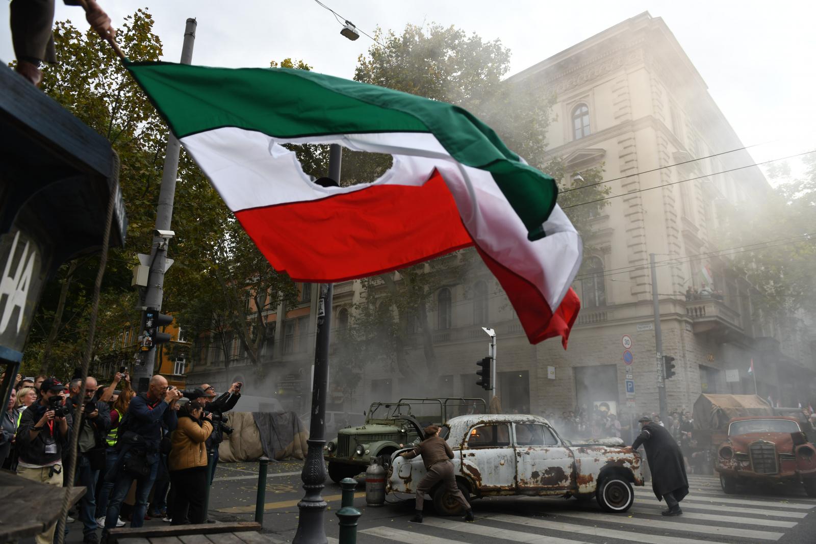 A Nemzeti Menet útját installációk szegélyezik, ugyanúgy, mint tavaly. Ez Radnai Márk, a Tisza Párt alelnöke, színházi rendező kézjegye. A Nagymező utca és az Andrássy út sarkán égő autóroncsokat lehet látni, füstgép is van, egy performansz keretében a statiszták rohamot indítanak a szovjet egységek ellen. Kicsivel később egy férfi egy kisebb emelvényen élőben zongorázza a Tavaszi szél...-t.