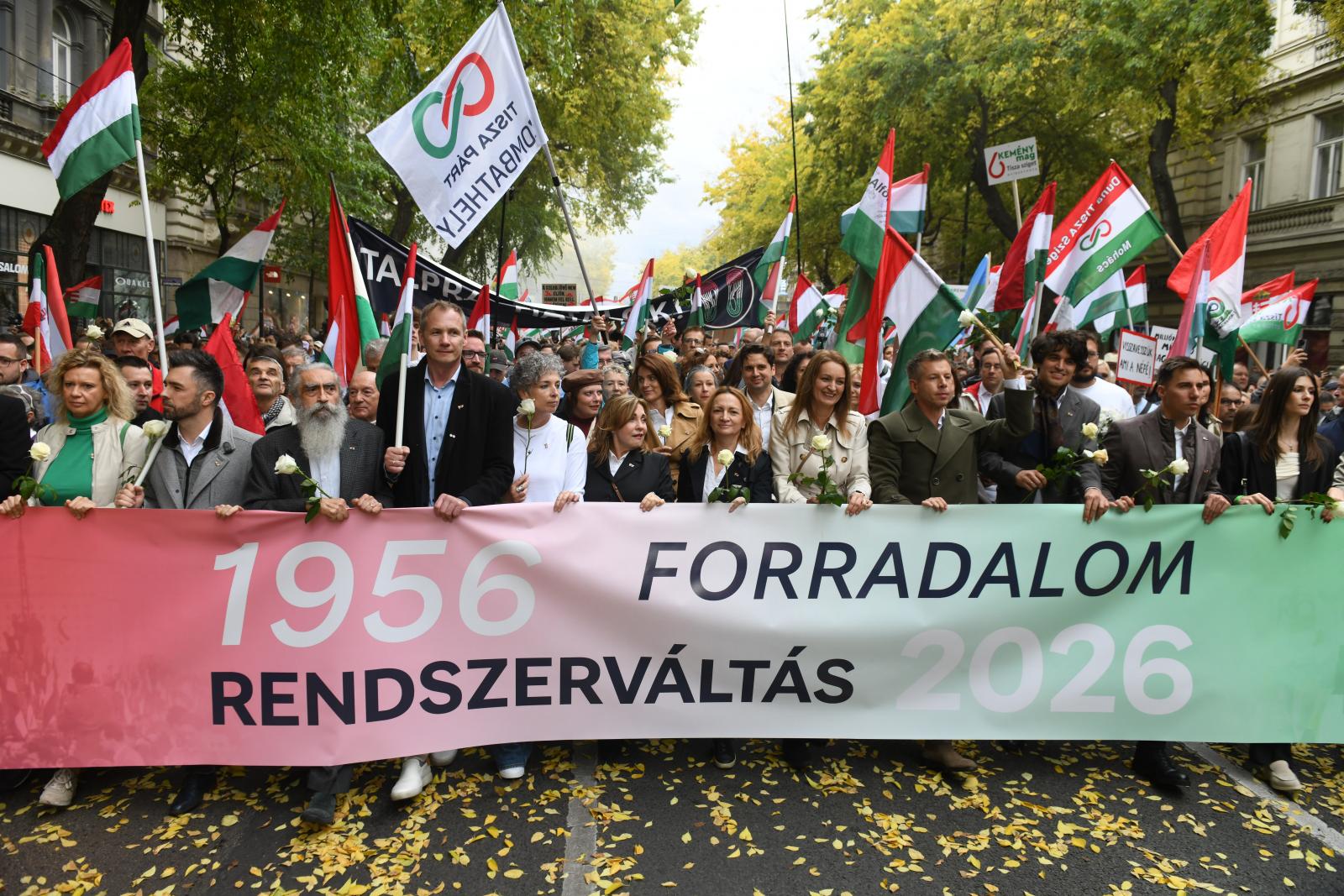 Az Andrássy úton molinókat is kifeszítettek: „Habár fölül a gálya (...) azért a víz az úr”, „Nincs jobb, nincs bal, csak magyar” és „A szabadság ott kezdődik, ahol megszűnik a félelem”. Az élen Magyar Péter, Bódis Kriszta, Ruszin-Szendi Romulusz, Kulja András, Kollár Kinga, Bujdosó Andrea, Radnai Márk, Rost Andrea, Nagy Ervin áll egy „1956: forradalom, 2026: rendszerváltás” feliratú molinóval.