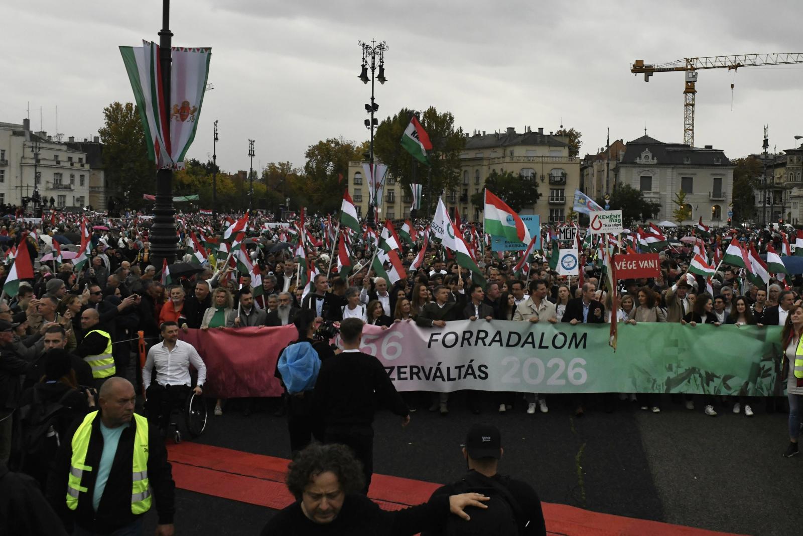 A Hősök terén elkezdődik a Tisza Párt 1956-os ünnepi műsora, archív felvételeken vetítik a 69 évvel ezelőtti eseményeket. Sinkovits Imre előadásában elhangzik Illyés Gyula Egy mondat a zsarnokságról című verse. Péter Petra műsorvezető egy autóroncs platójáról beszél, arra kér mindenkit, hogy húzódjon beljebb a téren, kár, hogy gyakorlatilag nincs hova beljebb húzódni, miközben a tömeg vége még az Operánál jár.