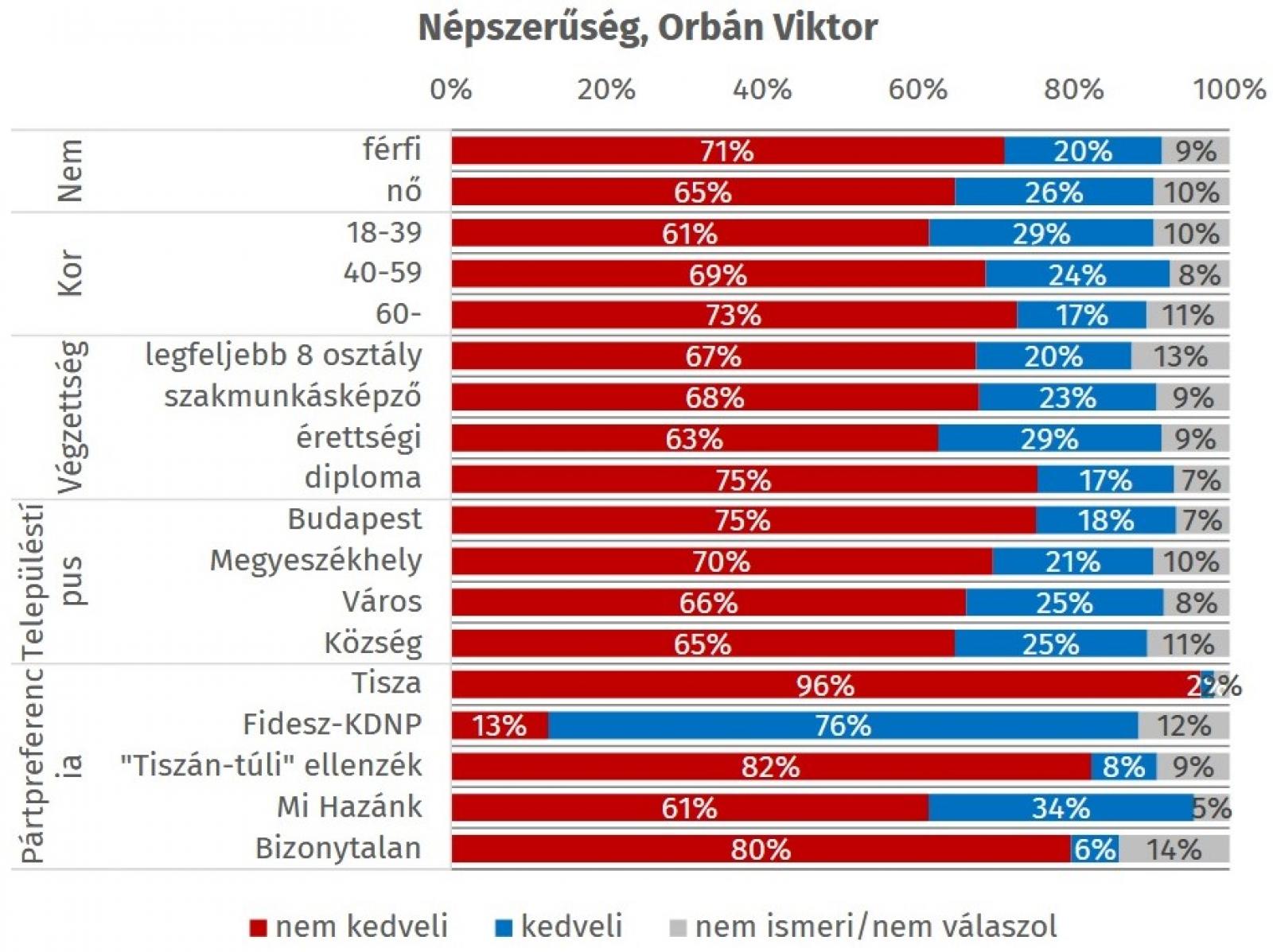 A vizsgált politikusok közül jelenleg Orbán Viktor az egyik legkevésbé kedvelt politikus, a kétharmaddal kormányzó miniszterelnököt a választók kétharmada elutasítja. Ebből 57 százalék élesebben, 10 százalék kisebb mértékben. Magyart 21 százalék nem kedveli egyáltalán, ez vélhetően a Fidesz-KDNP szavazók tábora, és további 16 százalék állítja, hogy inkább nem kedveli.