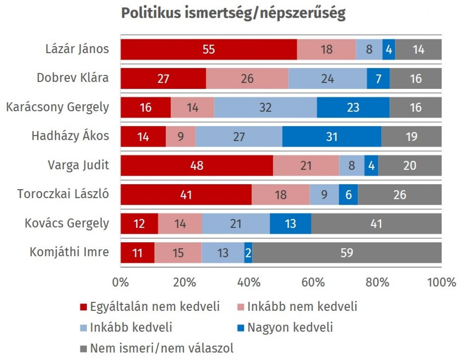 Lázár János közölte, azért vitte magával Orbán Viktor a washingtoni tárgyalásra, mert a következő időszakban feladata leszDobrev Klára népszerűbb a DK-nál, a harmadik, parlamenti küszöb körüli párt vezetőjét 7 százalék nagyon, 24 százalék inkább kedveli, ugyanakkor a válaszadók több mint fele nem kedveli, azaz inkább népszerűtlennek mondható országosan. Egyelőre úgy tűnik, a párt népszerűségét egyik irányba sem igazán mozdította el a vezetőváltás, küzd a bejutásért.