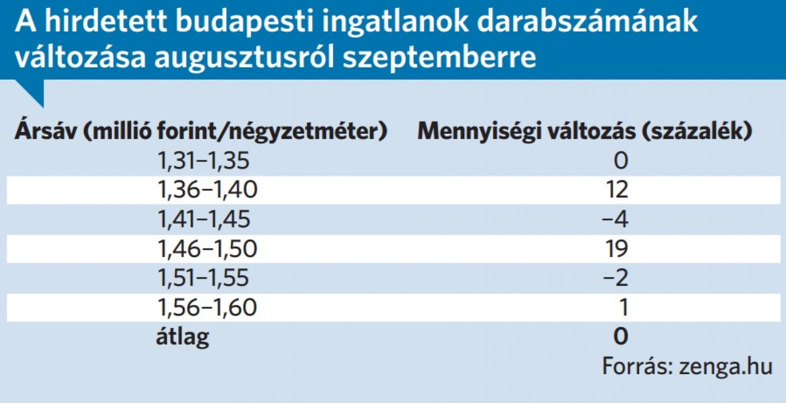 A program július eleji bejelentését követő két hónapban megduplázódott kereslethez gyorsan alkalmazkodtak az eladók: Budapesten az 1,5 milliós négyzetméterár-limit közvetlen közelében hirtelen felduzzadt a kínálat. A zenga.hu adatai szerint az 1,3–1,6 millió forintos sávon belül különösen az 1,46–1,5 milliós kategória bővült látványosan, csaknem 20 százalékkal augusztus és szeptember között, illetve az 1,36-1,4 milliós négyzetméterár kategóriában látni jelentősebb, 12 százalékos mennyiségi növekedést.