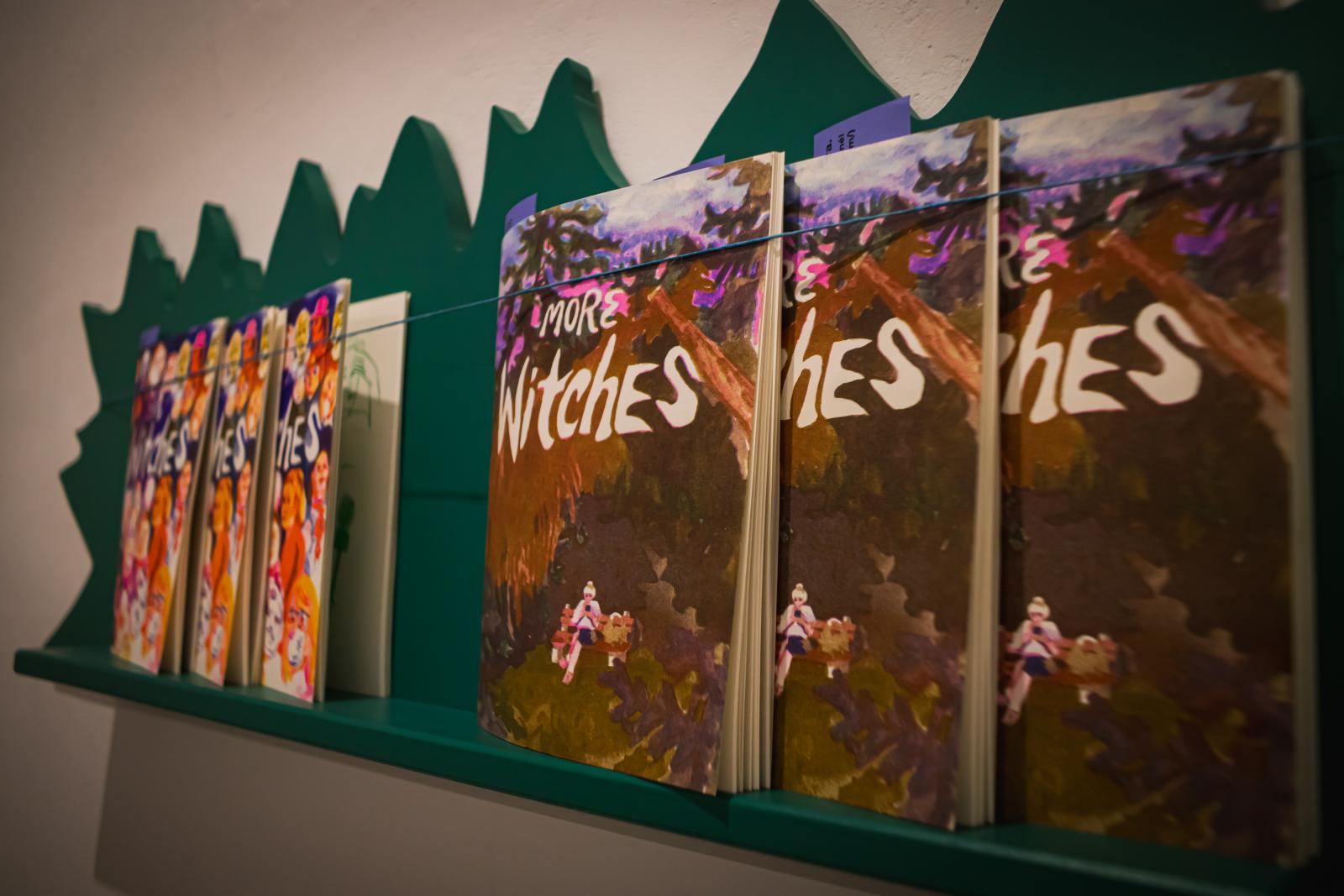 – Amikor ezt a tárlatot terveztem, az érdekelt, hogyan lehetne a képregény műfaját kiterjeszteni egy kiállítótérben, ezért is akartam a rajzokat textilekre is felvinni, és azokat a tér különböző pontjain installálni – mondta Dorottya, aki képzőművészként végzett, de idővel belekóstolt a képregények világába, és úgy döntött, maga is rajzol egyet. 2023-ban született meg az első zine-je – azaz mikrokiadó által megjelentetett, ISBN- és ISSN-számmal nem rendelkező kiadványa –, a most megjelent képregénye pedig egy korábbi folytatása, a művész 2024-ben már kiadott egy boszorkányos tematikájú füzetet Witches (Boszorkányok) címen, most pedig a More Witches (Még több boszorkány) című füzete látott napvilágot.