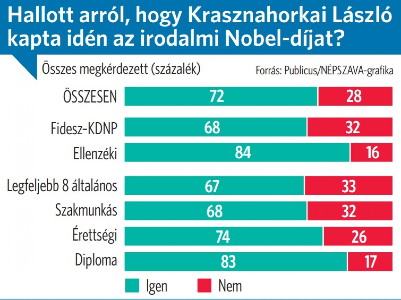 A megkérdezettek csaknem háromnegyede hallott arról, hogy Krasznahorkai László kapta idén az irodalmi Nobel-díjat – derült ki a Publicus Intézetnek a Népszava részére készített reprezentatív felméréséből.