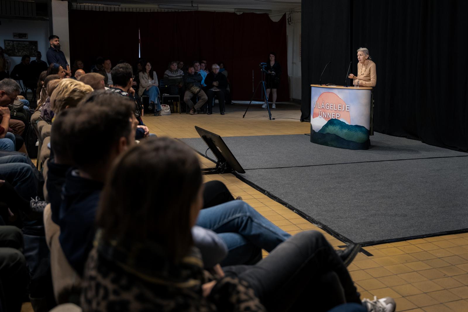 A levegőben frissen főtt növényi teák illata szállt, miközben a kiállítók – köztük a Jane Goodall Intézet és a Tudatos Vásárlók Egyesülete – standjainál már reggeltől pezsgett az élet. A rendezvényt a házigazdák, Fait Federika, a zCast, HVG fenntarthatósági podcastjának és Litkai Gergely, a Zöld Válasz podcast műsorvezetői azzal vezették fel, hogy 2075-ben a klímaváltozás már nem fenyegetés, hanem múltbeli tanulság. „Környezeti lábnyomunk csökkentésére tudom ajánlani a fekvőgipszet” – ironizált a humorista, olyan oldott hangulatot teremtve, amelyben a hallgatók is egyre nyitottabbá, befogadóbbá váltak.