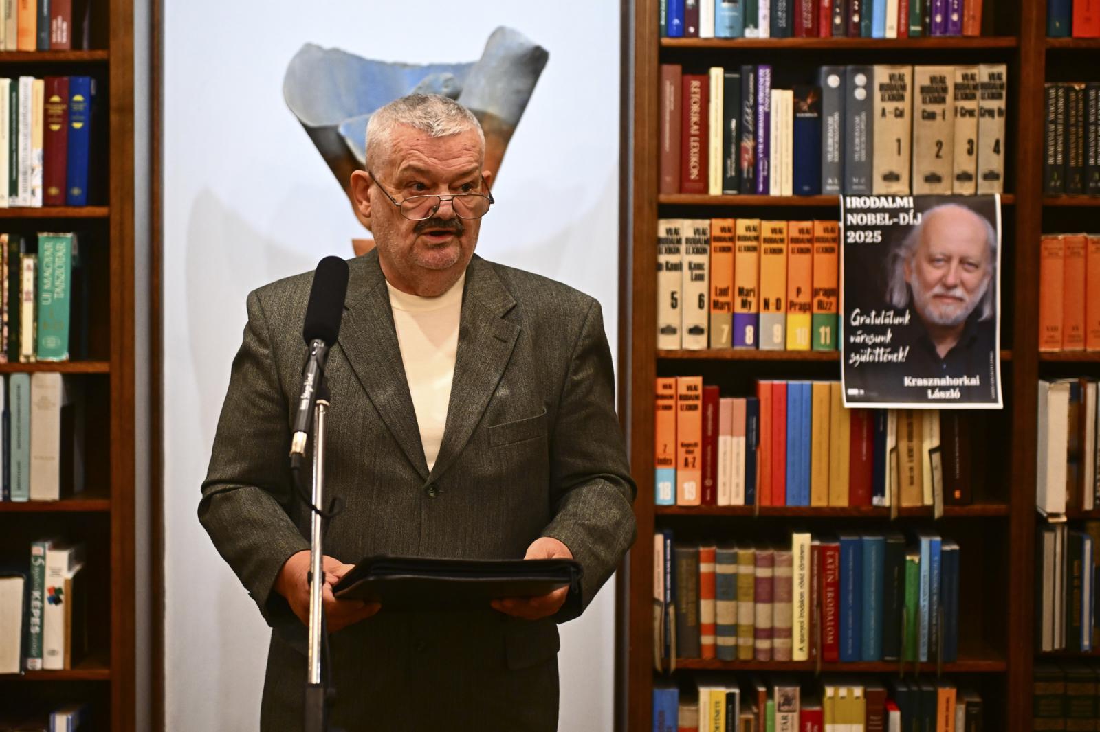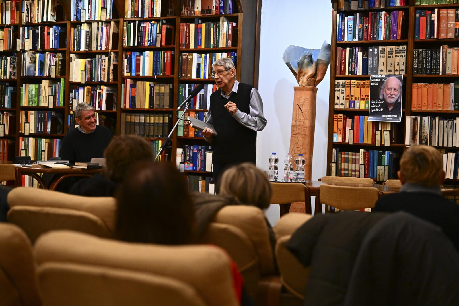 – mondta a férfi. Ő Krasznahorkainak egy, a reményről szóló korábbi írását olvasta fel, szembeállítva azt a vasárnapi, stockholmi díszelőadáson elhangzott beszédével. – Huszonegy kötetem van Krasznahorkaitól, és én már nagyon régen várom ezt a Nobel-díjat. A cimboráim jósnak neveztek, és hát, bejött a jóslatom. Ha valaki megérdemelte, akkor az ő volt. Nehéz olvasni Lacit, olvasom is természetesen, az utóbbi két könyv, amit olvastam tőle a Zsömle odavan és a Herscht. Tudom ajánlani, mert ezek valamivel könnyedebbek, mint például a Sátántangó – mondta Pataki.