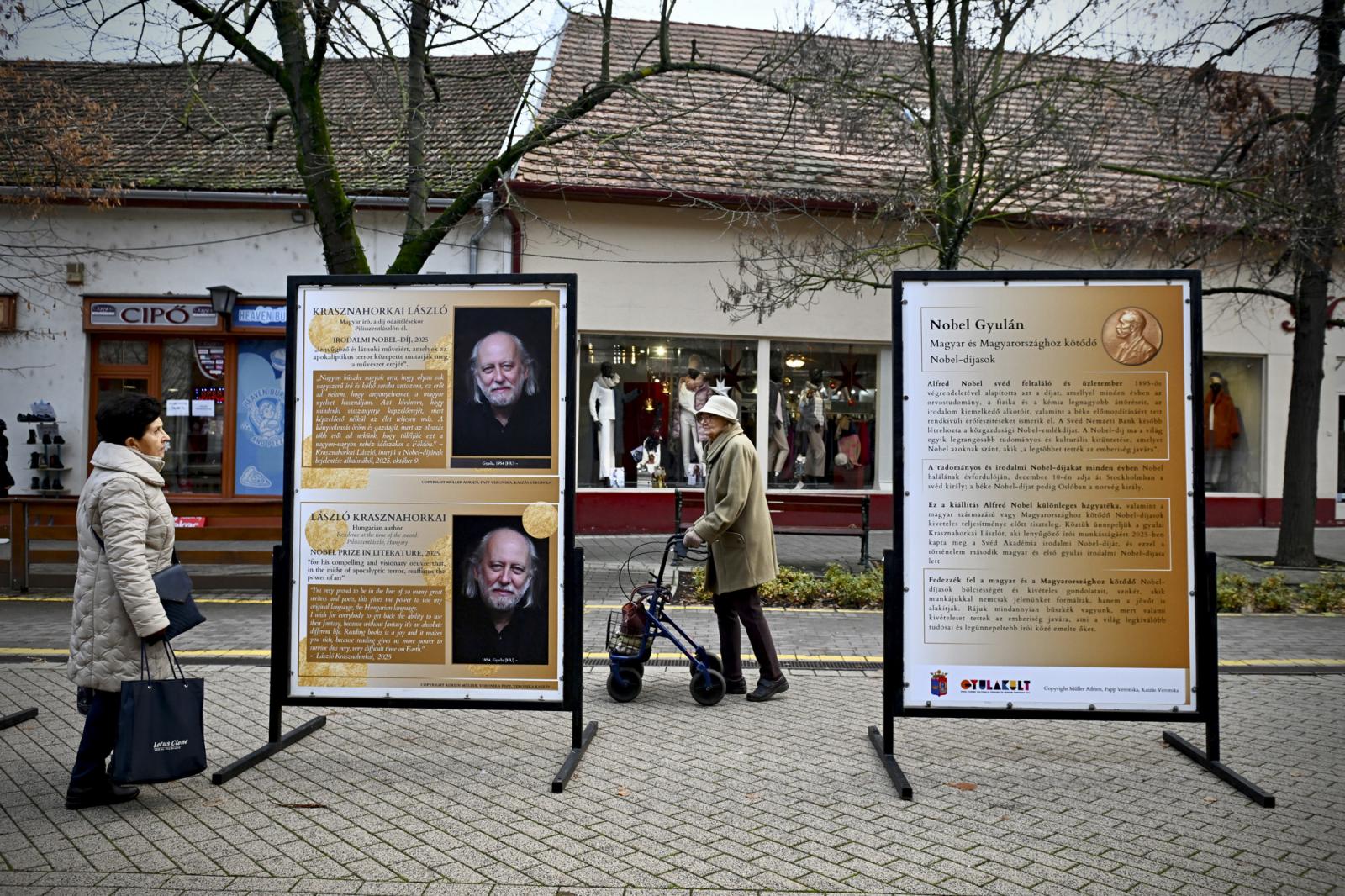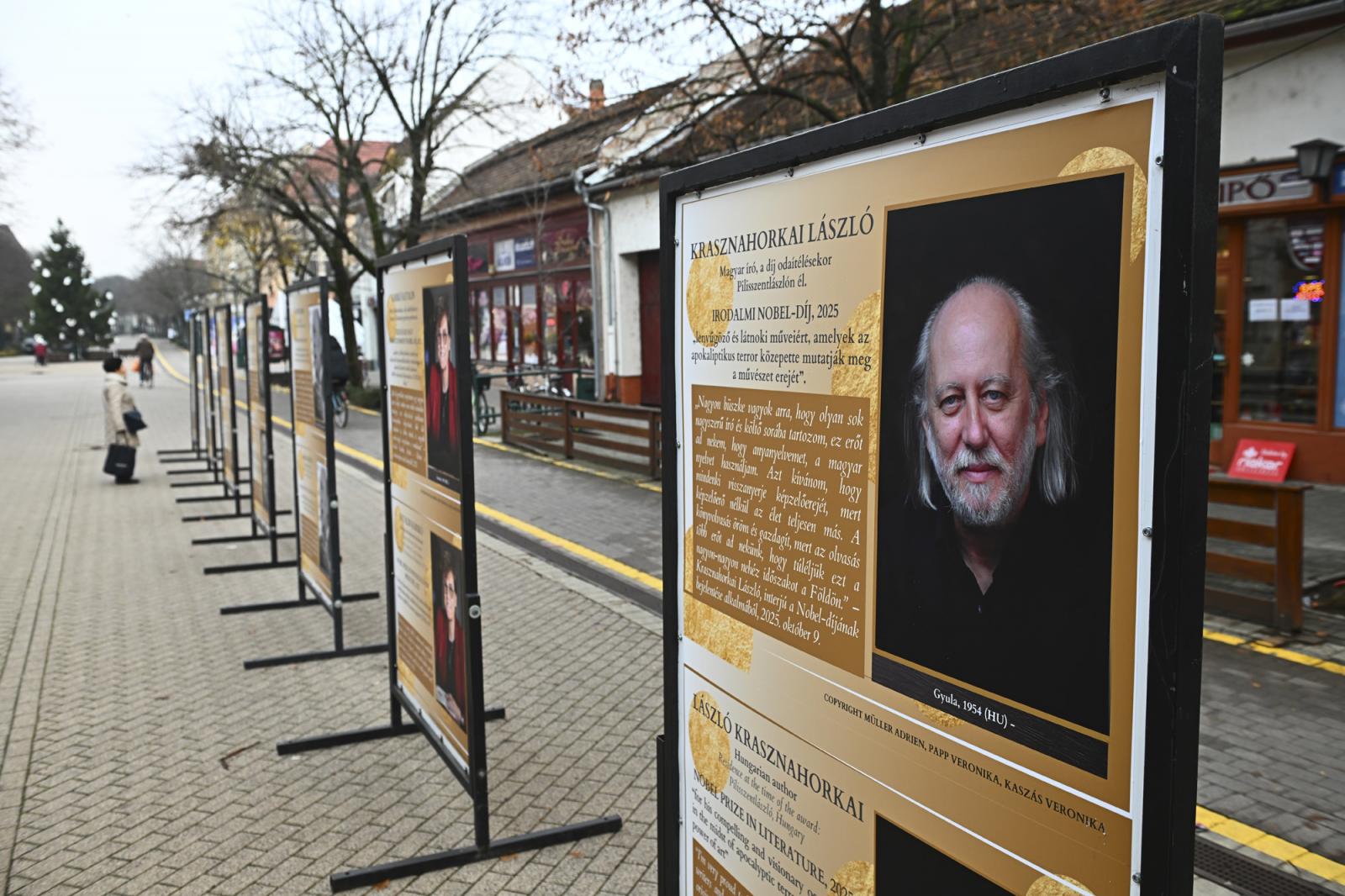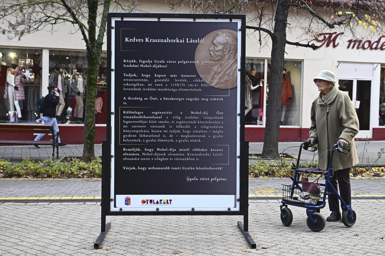 Krasznahorkai László: A remény nálam éppen végleg kifogyottA Városház utcában egy magyar Nobel-díjasokat bemutató kiállítást nézhetünk meg, ahol a következő bevezető olvasható: „Kedves Krasznahorkai László! Kérjük, fogadja Gyula város polgárainak gratulációját Irodalmi Nobel-díjához! Tudjuk, hogy kapott már üzenetet A4-es lapon, ereszcsatornán, gratuláló levelek, cikkek, posztok sokaságában, mi ezen a 115X176 cm-es felületen (is) örvendünk irodalmi munkássága elismerésének. A dicsőség az Öné, a büszkeséget engedje meg nekünk is”. A tárlat kiemeli azt is, hogy „regényeinek köszönhetően a mi szeretett városunk is felkerült a világirodalom könyvespolcára, hiszen mi tudjuk, hogy írásaiban – mégha láthatatlanul is, de – meghatározóak a gyulai helyszínek, a gyulai élmények, a gyulai alakok”.
