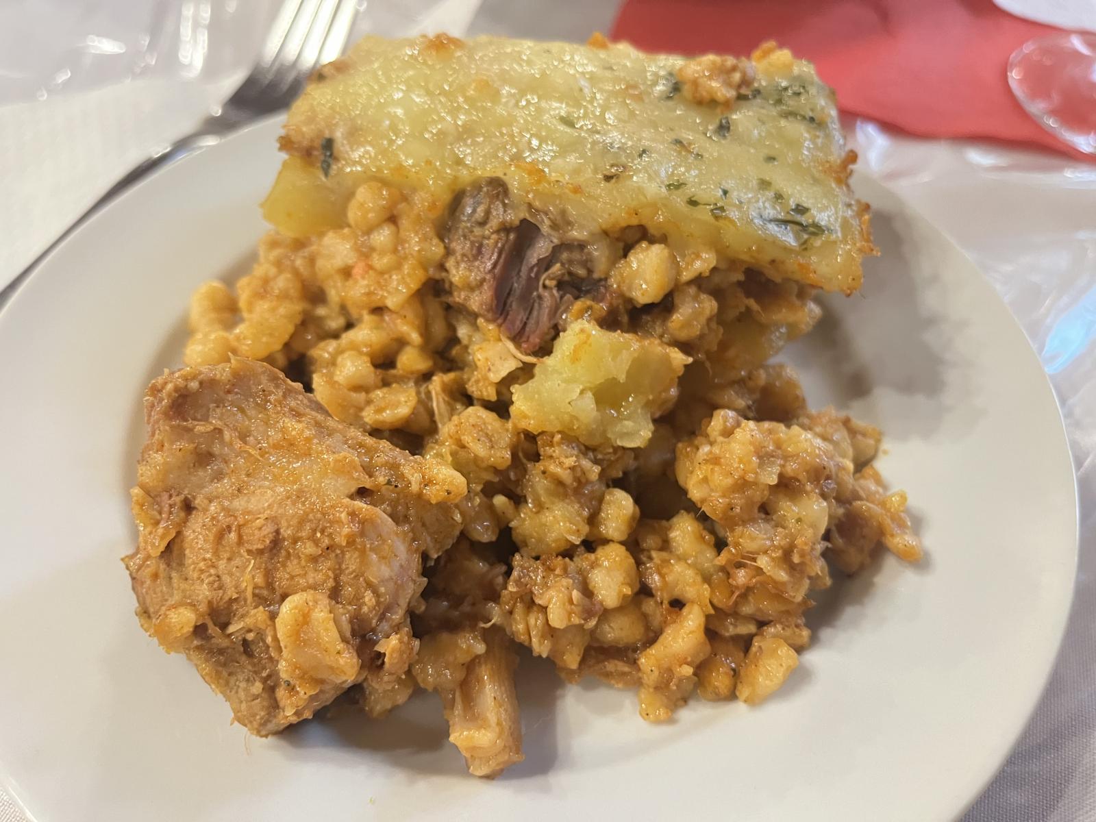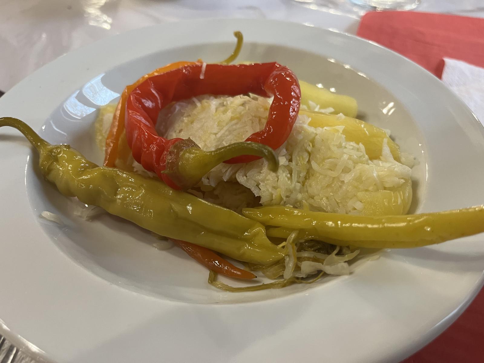 A birka- és a marhapörkölt közül az utóbbira voksolunk némi főtt burgonyával, csak a kitálalás látványa miatt. Sűrű szaftunk magas minőségű édes-nemest sejtet, és mutatóba egészen finoman csípőset, a hagymamennyiség is szép harmóniában van, a hús kifogástalanul omlik. Mellé káposztával töltött paprikát és színes pepperoniválogatást szegedetünk a savanyústálból. Akár fel is állhatnánk dolgunk végeztével és a jóllakottság érzésével, de hát nem szórakozni vagyunk. A svédasztal töltött káposztával amúgy is hívogat, odébb nagy tál zsíros tejföl, abból loccsantjuk nyakon. A kellemesen res levelekbe göngyölt darált hús-rizs arány puhaságába se tudunk belekötni. Már igazán csak az íze miatt kanalazunk nagy kedvencünkből, a házi tarhonyából, amiben színsertés- és marhadarabok keverednek: a sajtot már túlzásnak is érezzük a tetején, de ezt talán csak az emberesen feszülő pólónk mondatja velünk.