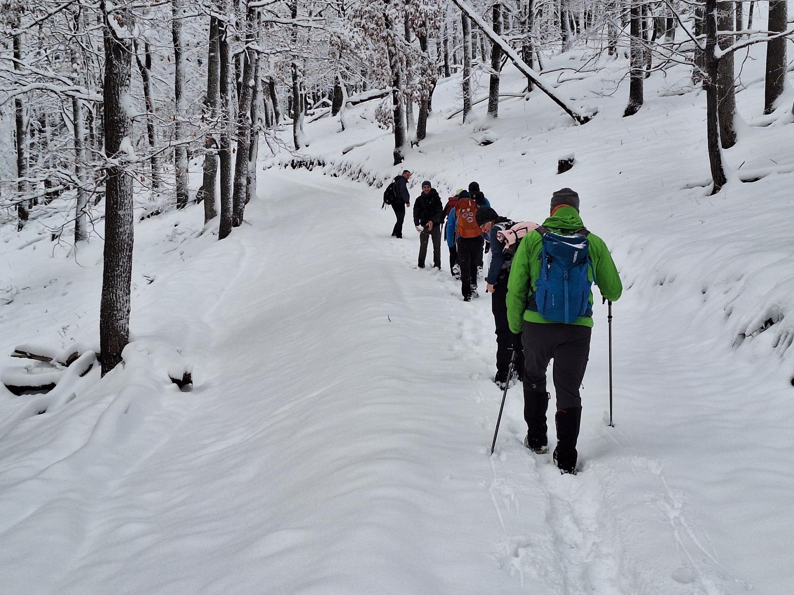 Beljebb érve viszont elérkeztünk egy olyan részre is, ahol már szűz hó volt. Ez a rész különösen tetszett csapatunknak, volt, aki nem tudta megállni, hogy ne feküdjön bele. A varázslatos táj azonban nem terelheti el az ember figyelmét: résen kellett lenni, mert a hóval fedett turistaúton nem lehetett látni a köveket, mélyedéseket. Vannak ugyan jelek, amik utalhatnak rájuk (például vízmosás), de egy tapasztalatlanabb túrázó figyelmét könnyen elkerülhetik. Az alacsonyabb részeken pedig a bozótos áthatolhatatlannak tűnő szövedéke állta utunkat: olykor beleakadt egy-két vadszeder ág a kabátunkba.