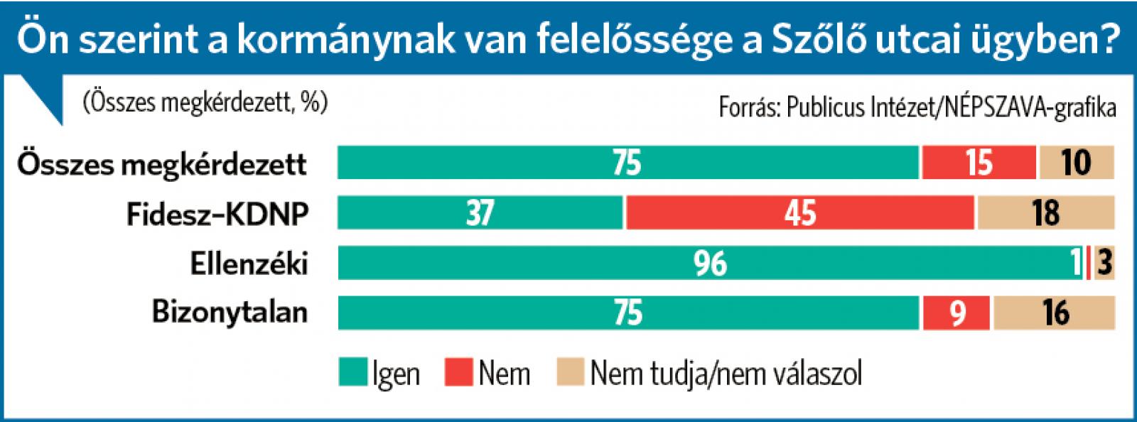 A magyarok többsége elégedetlen az Orbán-kormány Szőlő utcai ügyre adott reakciójával, még a fideszesek is megosztottak21 Kutatóközpont: a magyarok 49 százaléka szerint Pintér Sándornak, 40 százaléka szerint Orbán Viktornak kellene lemondania a Szőlő utcai ügy miattEgyértelmű, háromnegyedes többség gondolja, hogy a kormánynak van felelőssége a Szőlő utcai ügyben, ennek ellenkezőjét 15 százalék válaszolta. Minden tizedik ember nem felet erre a kérdésre, a válaszadást elkerülők a kormánypárti szavazók között a legmagasabb, 18 százalék. A Fidesz szavazóinak egyébként 37 százaléka tartja felelősnek a kormányt. Az ellenzékiek között ez 96, a bizonytalanoknál pedig 75 százalék.