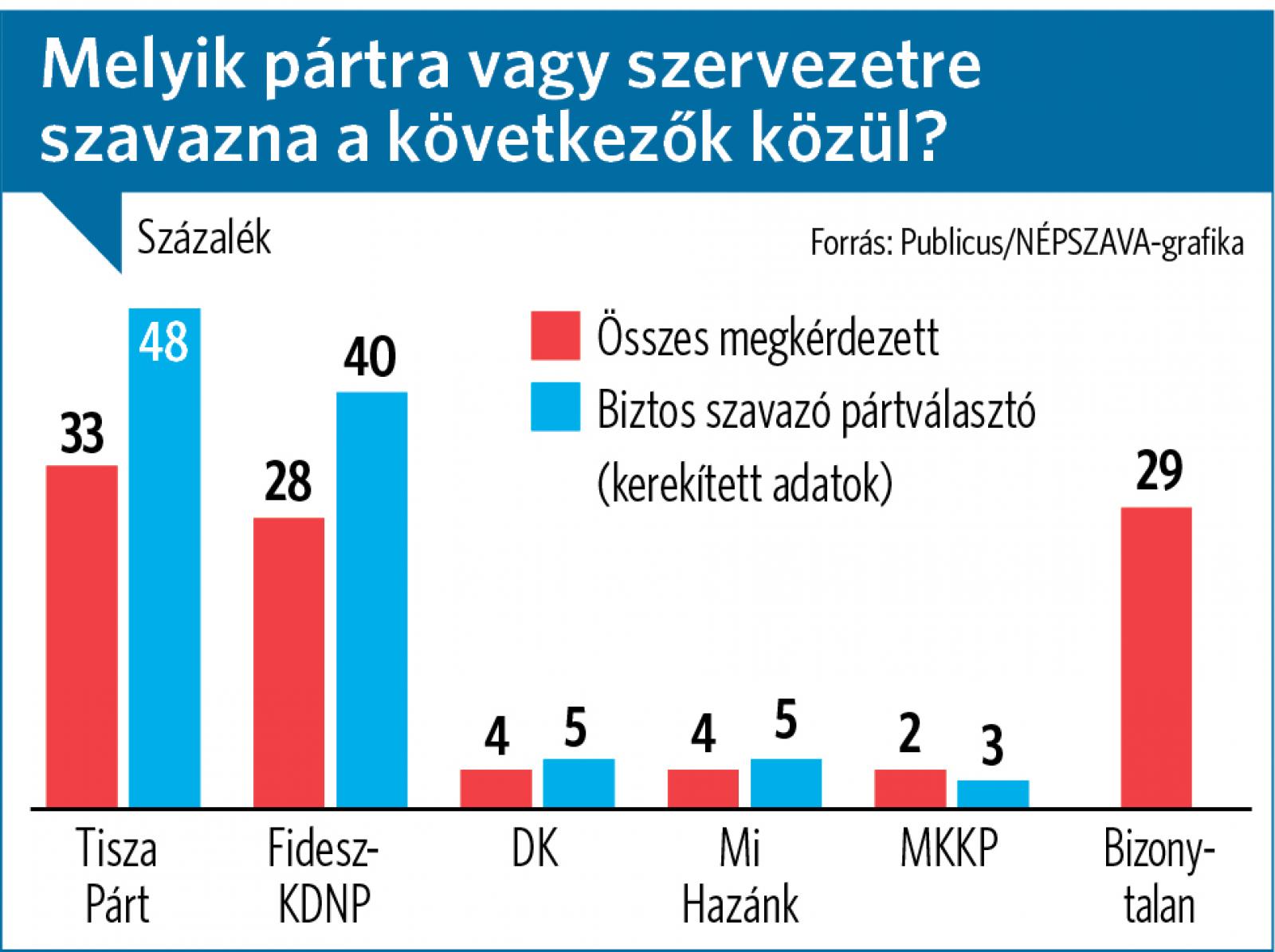 A teljes népességben a Tisza Párt 33, a Fidesz 28 százalékon áll, míg a biztos szavazó pártválasztók között 48-40 az állás Magyar Péter pártja javára – mutatta ki a Publicus Intézet decemberi kutatása, amely a Népszava megbízásából készült.