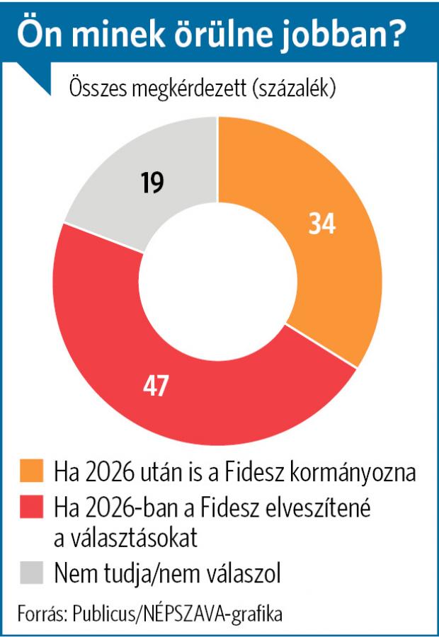 Látható azonban, hogy az összes megkérdezett 47 százaléka szeretné, ha a Fidesz megbukna a 2026-os választáson, és mindössze 34 százalék adna újabb esélyt Orbán Viktornak. A társadalom minden iskolázottsági fokán - 8 általános végzettségtől a diplomásokig – nagy többségbe kerültek azok, akik kormányváltást akarnak.