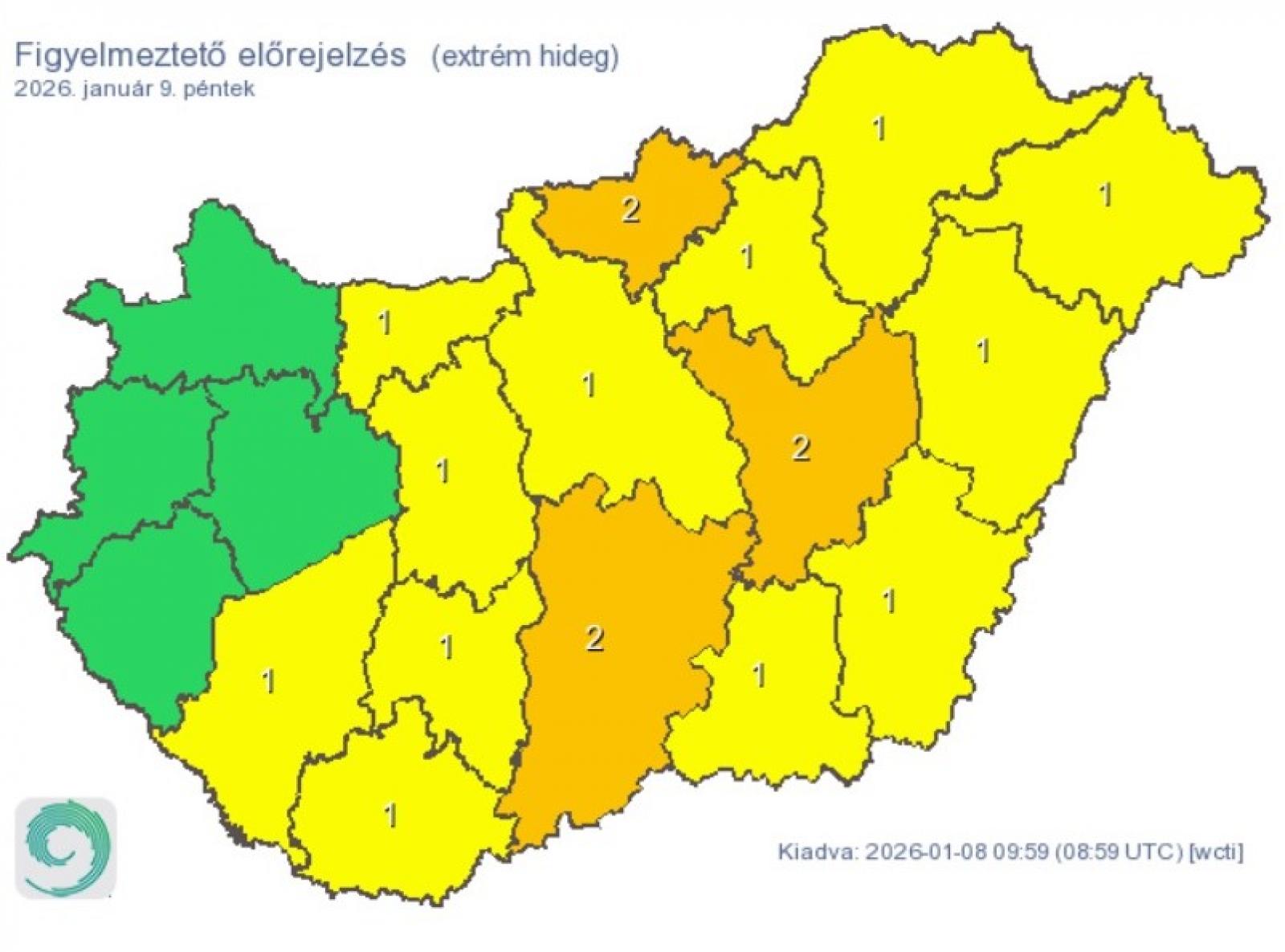Három megyére (Bács-Kiskun, Nógrád és Jász-Nagykun-Szolnok) másodfokú, további tizenkét megyére (Pest, Baranya, Békés, Borsod-Abaúj-Zemplén, Csongrád-Csanád, Fejér, Hajdú-Bihar, Heves, Komárom-Esztergom, Somogy, Szabolcs-Szatmár-Bereg és Tolna) elsőfokú figyelmeztetést adtak ki péntekre az extrém hideg időjárás miatt.