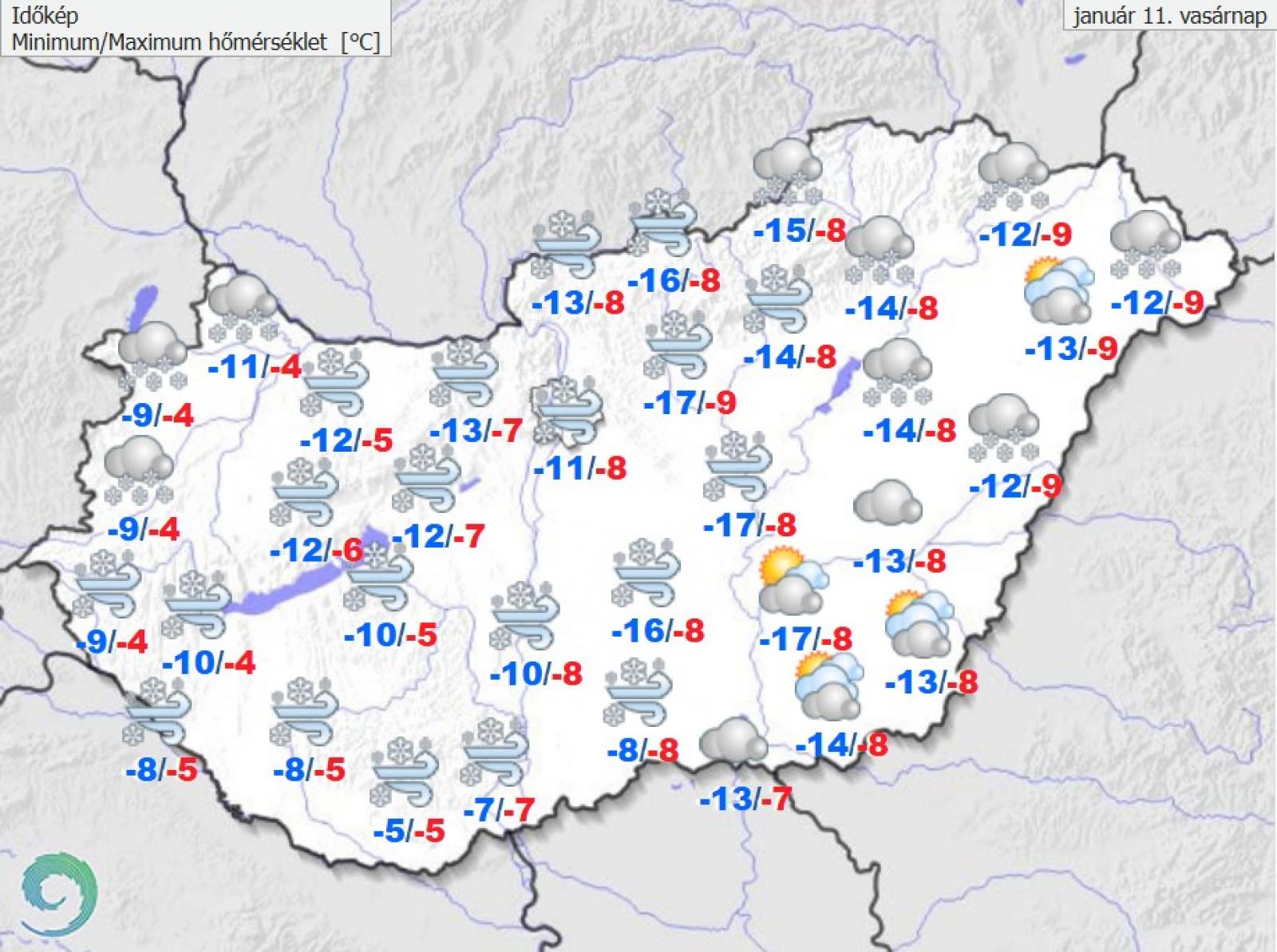 Vasárnap közepesen és erősen felhős területek és időszakok váltják egymást. Elszórtan várható kisebb havazás, hózápor. Az északnyugati, északi szél a Dunántúlon és északkeleten nagy területen lesz erős, néhol viharos, amely elsősorban a Dunántúlon és a Bodrogköz térségében hófúvást is eredményezhet. A legalacsonyabb éjszakai hőmérséklet általában -13, -7 fok között alakul, de a kevésbé felhős és szeles részeken és a fagyzugokban ennél több fokkal hidegebb lehet. A legmagasabb nappali hőmérséklet -8, -3 fok között várható.