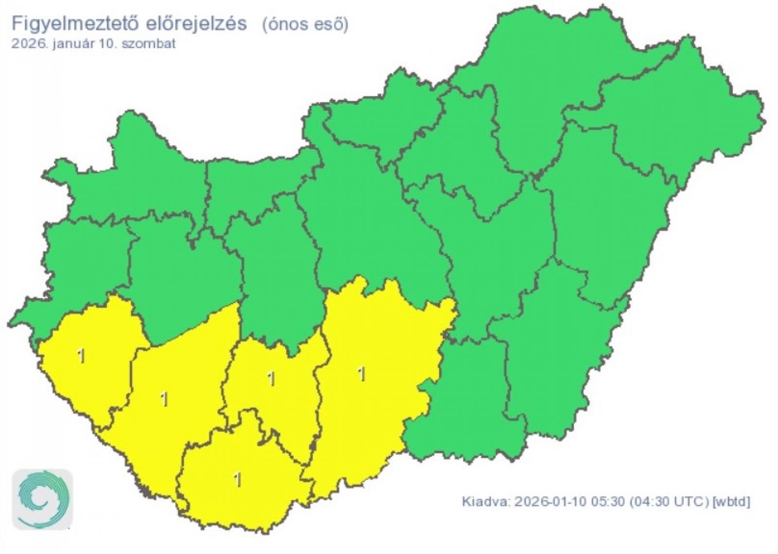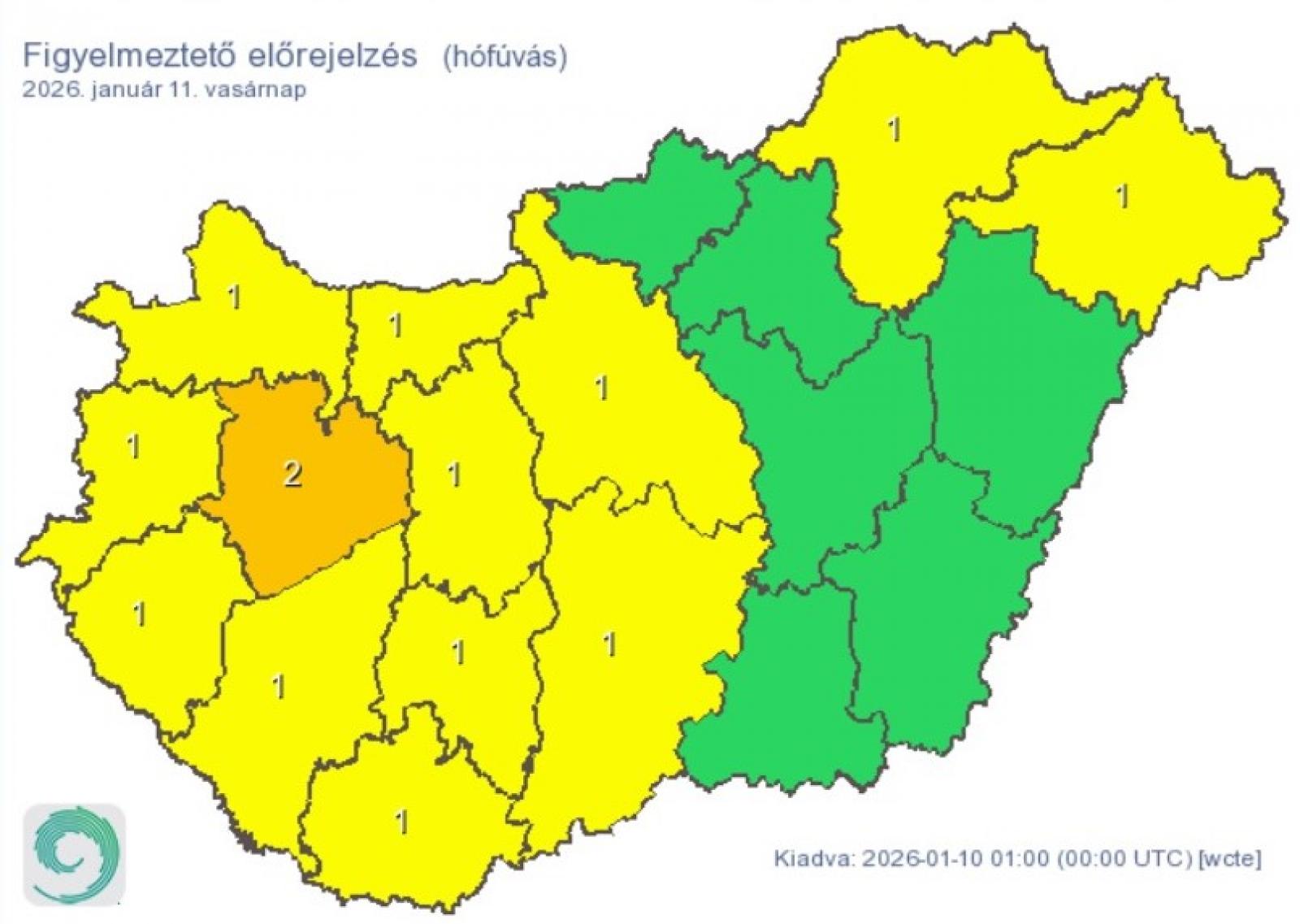 Tíz megyére (Borsod-Abaúj-Zemplén, Fejér, Győr-Moson-Sopron, Hajdú-Bihar, Komárom-Esztergom, Somogy, Szabolcs-Szatmár-Bereg, Vas, Veszprém és Zala) hófúvás, további öt megyére (Baranya, Bács-Kiskun, Somogy, Tolna és Zala) pedig ónos eső miatt adott ki elsőfokú figyelmeztetést a meteorológiai szolgálat.