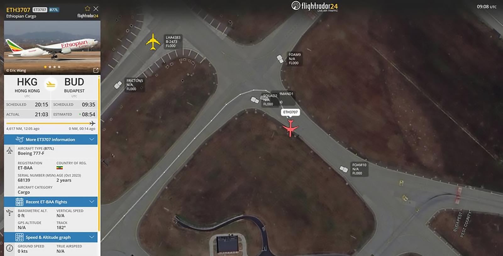 Jelentős incidensről egyelőre nem tudni, arról az AIRPortal számol be a Facebook-oldalán, hogy 10 óra körül az állóhelyre történő gurulás közben megcsúszott a gurulóúton az Ethiopian Cargo Boeing 777F típusú teherszállító repülőgépe. A repülőgép orrfutója elhagyta a gurulóút burkolatát, a személyzet vontatót kért. Mivel egy ilyen Boeing 777F-est a nagy tömege miatt nem tudnak elvontatni, így részben vagy egészben kirakodják, hogy visszavontathassák a gurulóútra.
