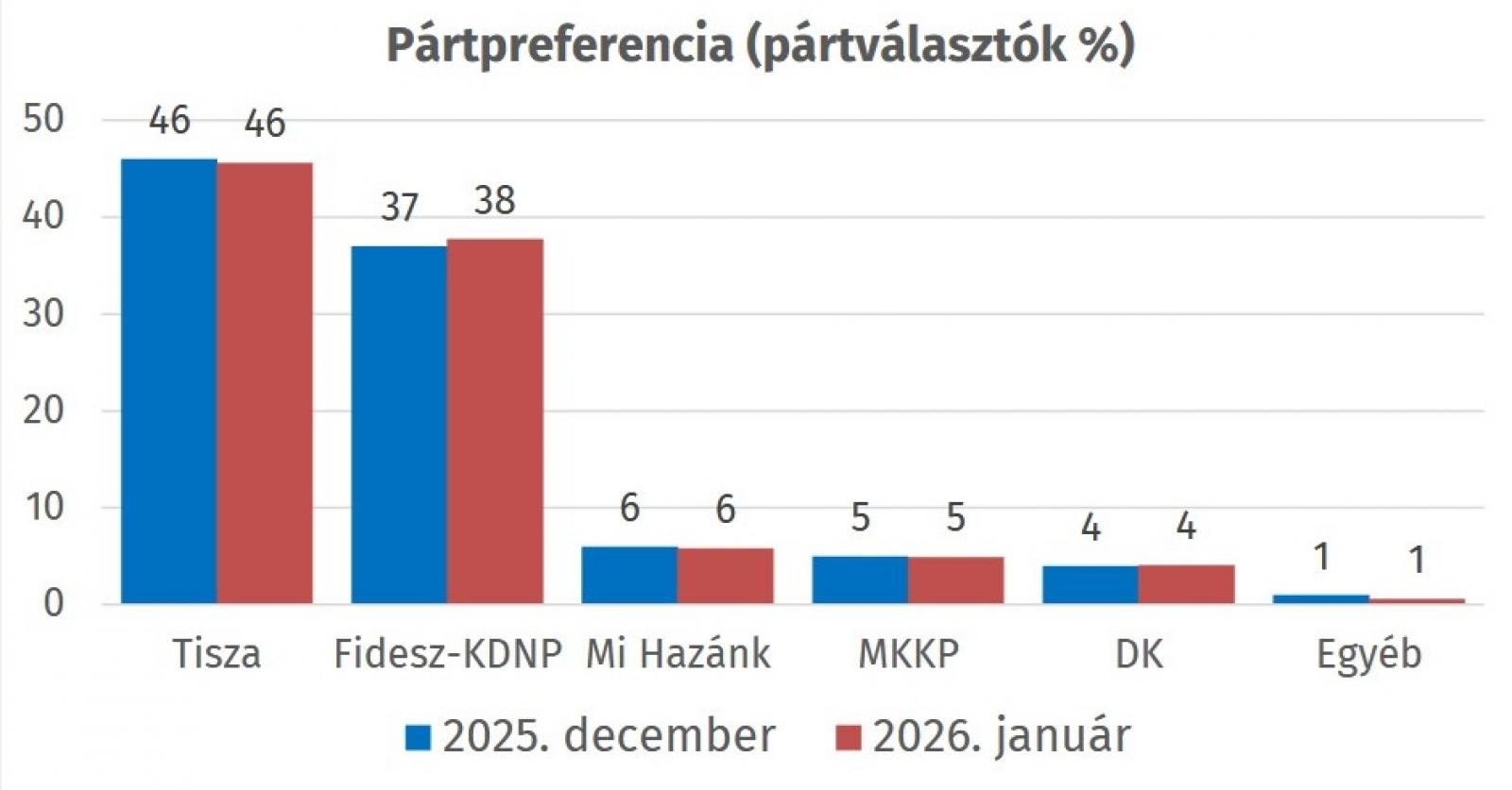 Az év elején viszonylag keveset változtak a pártpreferenciák. A Tisza támogatottsága a teljes népesség körében változatlan, míg a Fidesz-KDNP támogatottsága 1 százalékponttal nőtt. 43-38 az állás a Tisza javára, a különbség 5 százalékpont – derül ki a Republikon Intézet legfrissebb, január 15-e és 20-a között készült kutatásából.