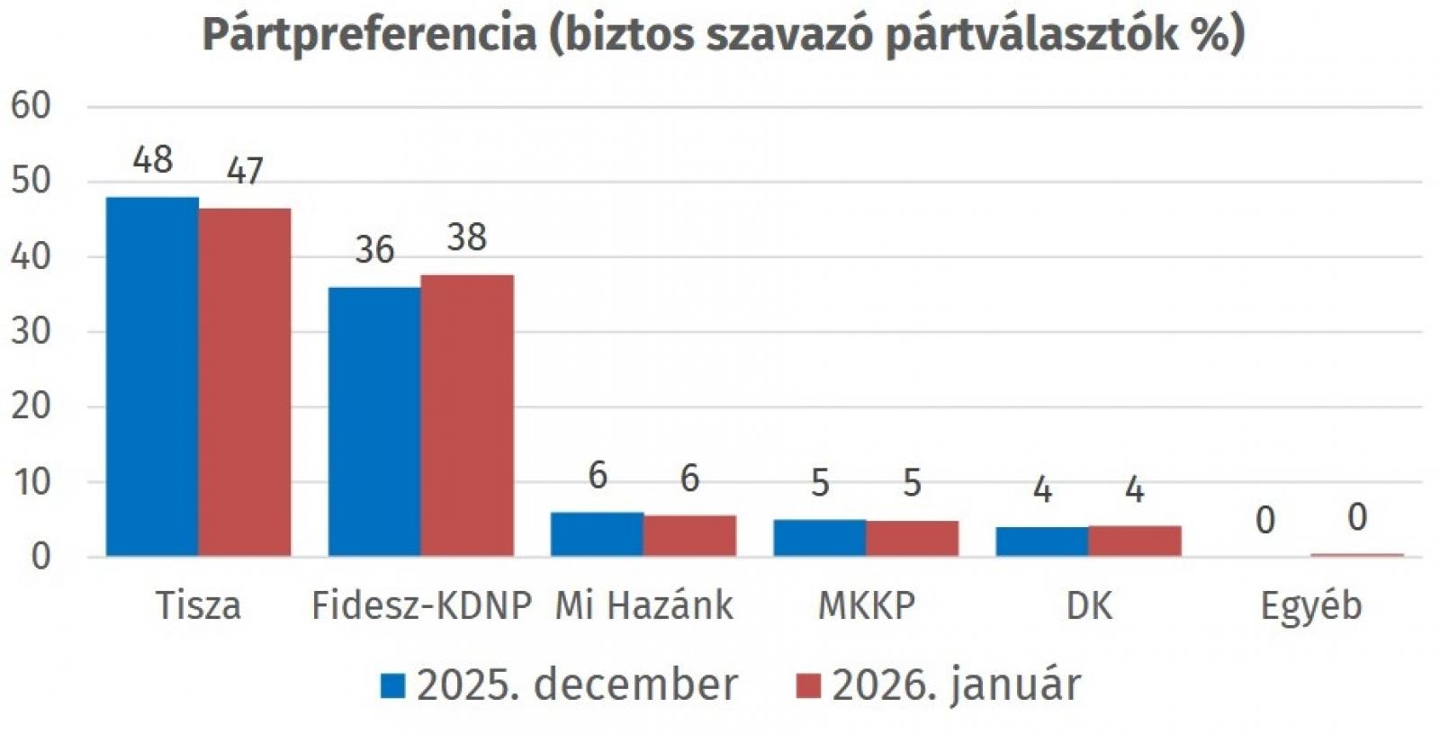 a biztos szavazó pártválasztók körében hibahatáron belül csökkent a Tisza előnye, miután 1 százalékpontot csökkent a Tisza, 2 százalékpontot nőtt a Fidesz-KDNP támogatottsága, a Tisza előnye így 9 százalék.