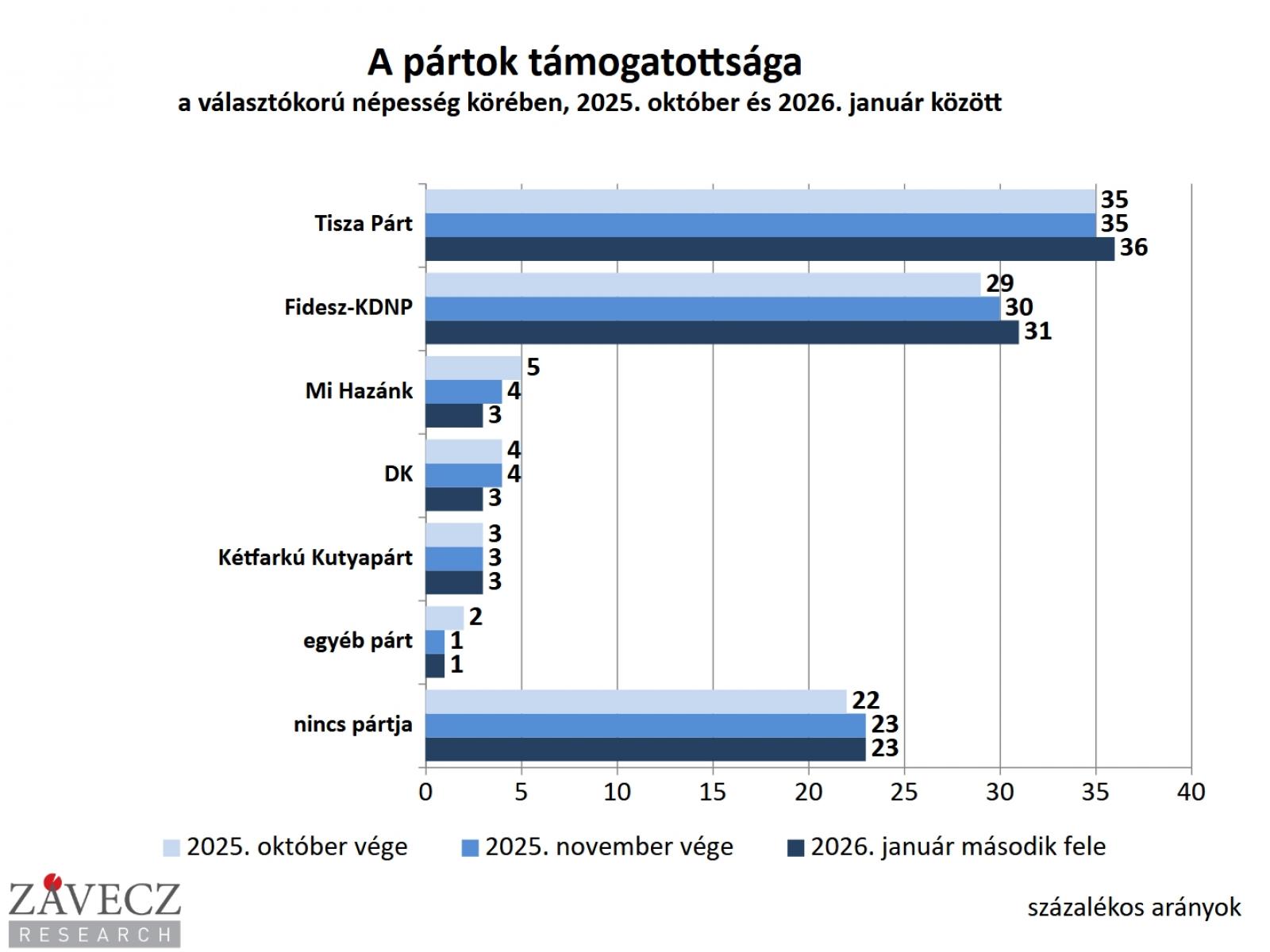 A felmérés 1000 fős mintán készült az ország felnőtt népességét reprezentáló mintán, úgynevezett hibrid adatfelvételi módszerrel – telefonos és online kérdezés együttes alkalmazásával –, az adatfelvételre 2026. január 19. és 24. között került sor. Az eredmények szerint folytatódott Tisza és a Fidesz-KDNP táborának bővülése: előbbi tavaly nyár óta 32-ről 36 százalékra erősödött, utóbbi 26-ról 31 százalékra.