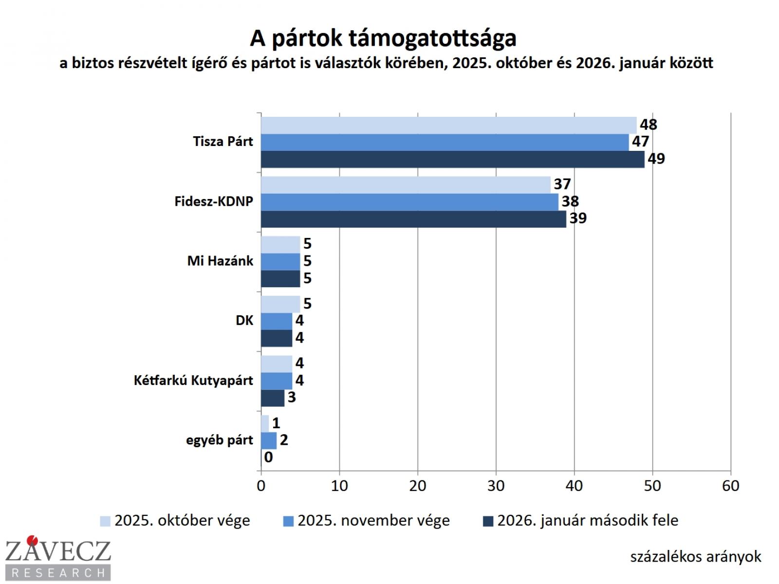 November vége óta minkét párt 1-1 százalékponttal növelte a támogatottságát: jelenleg a Tisza Párt mögött a 2,9 millió szavazópolgár áll, a Fidesz mögött pedig 2,5 millió. Három párt azonos nagyságú táborral rendelkezik – a Mi Hazánknak, a Demokratikus Koalíciónak és a Kétfarkú Kutyapártnak 3-3 százalékos a támogatottsága –, míg a pártnélküliek aránya 23 százalék.
