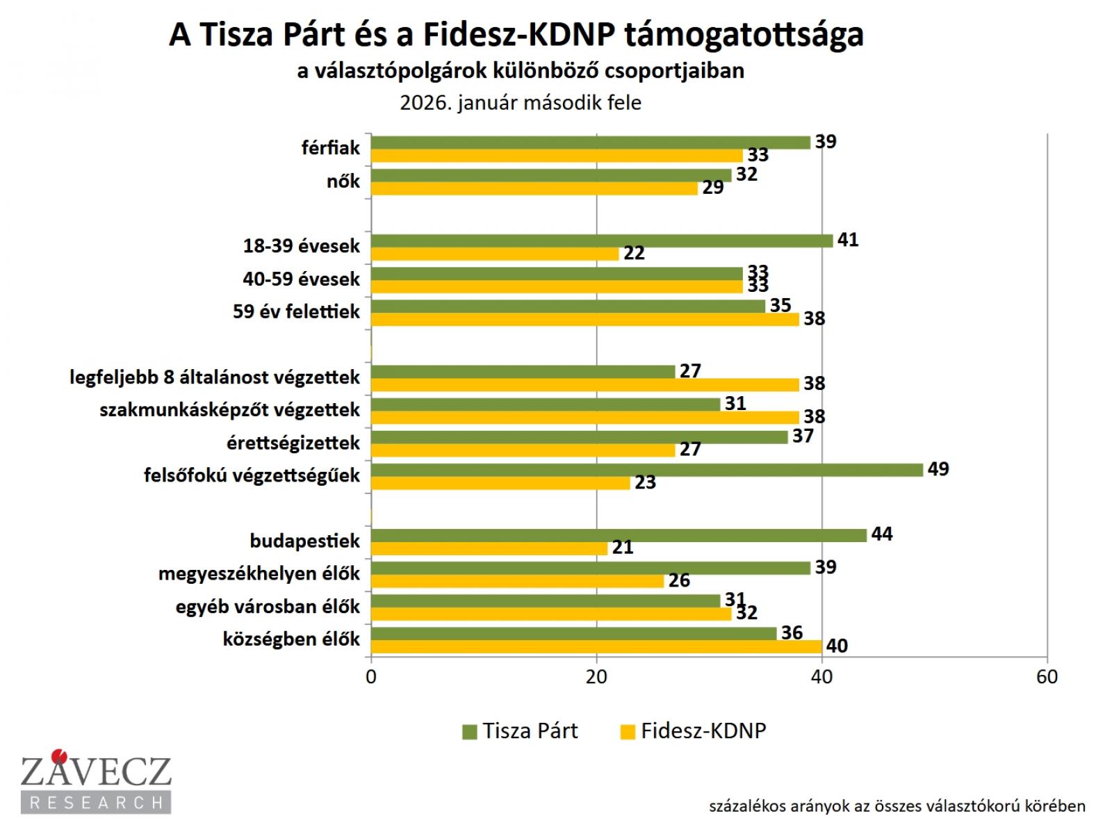 A felmérés szerint a diplomásoknál kétszeres fölényben van a Tisza Párt (49-23 százalék), és az érettségizettek körében is jelentős az előnye (37-27 százalék). A szakmunkás képzettségűek, és még inkább az általános iskolai végzettségűek csoportjaiban viszont a Fidesz-KDNP listájának van több támogatója – ennek aránya 38-31, illetve 38-27 százalék.