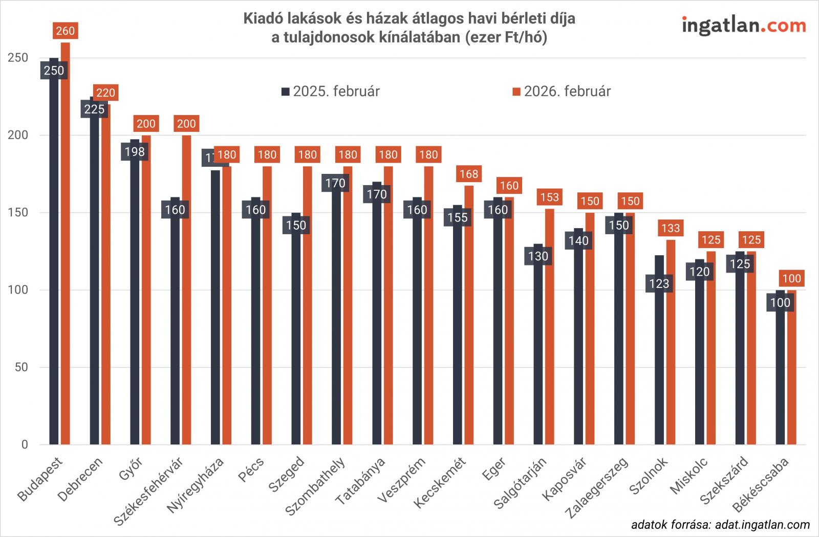 míg számos vármegyeszékhelyen, Nyíregyházán, Pécsen, Szegeden, Szombathelyen, Tatabányán és Veszprémben 180 ezer forint lakbérek mediánja.