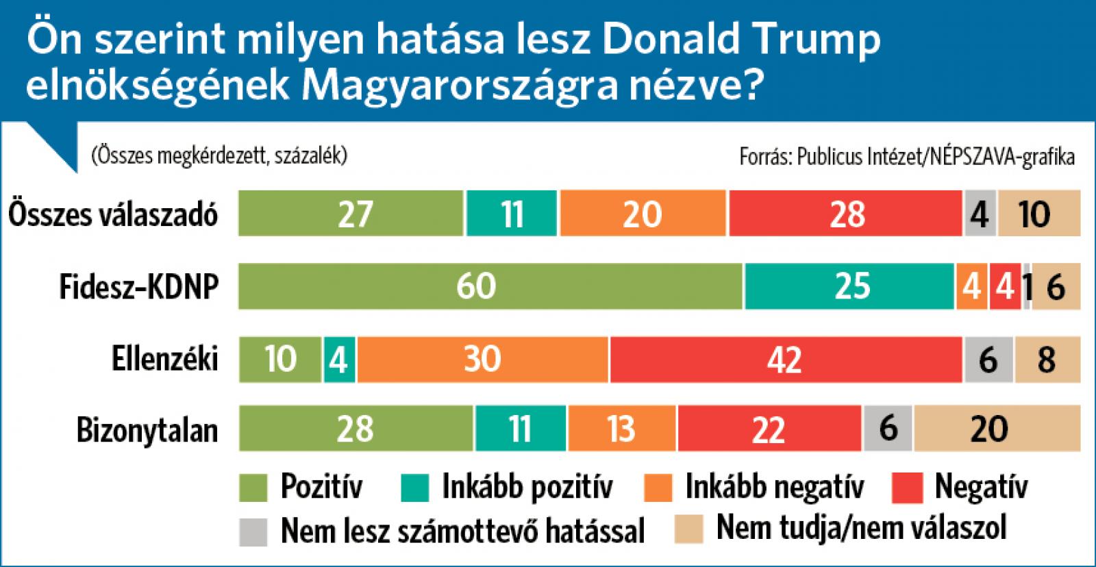 Pozitív vagy inkább pozitív kimenetelt ezzel szemben csak az emberek 21, illetve 12 százaléka vár, és csak százból egy ember szerint nem lesz számottevő hatással. Ebben a kérdésben is a kormánypártiak a legbizakodóbbak Trump jövőbeni örökségét tekintve: 48 és 28 százalékuk gondolja pozitívnak vagy inkább pozitívnak a globális politikai hatását. Amikor a Publicus azt kérdezte, hogy vajon Magyarországra nézve mit hozhat Trump elnöksége, az összes válaszadó 38 százaléka számít pozitív következményekre, 48 százalék viszont ellenkezőképpen gondolkodik. Az átlagot itt is a Fidesz-szavazók húzzák föl, összesen 85 százalékuk szerint inkább jól jön ki Magyarország Donald Trump világpolitikai kavarásából.