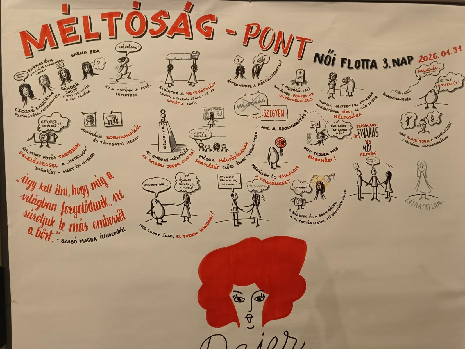 Mindannyian egyetértettek abban, hogy a női szolidaritásban még van hova fejlődnünk. A saját méltóságvesztés egy adott pillanatban talán könnyebben átvészelhető, ha van női támogatás. Sajnos sokszor tapasztalható, hogy nőtársaink csípőből ítélkeznek, holott nem ismerik a másik nő élettörténetét. Nincs tolerancia, nincs megértés, csak az ítélkezés. Ahhoz, hogy ezen változtatni tudjunk, első lépésként saját magunknak kell beismernünk, ha hibázunk és őszintén felelősséget vállaljunk a tettinkért.