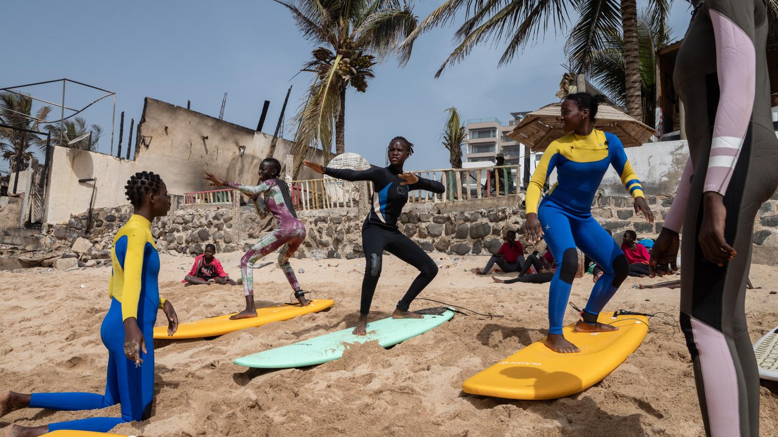 Dakar partjainál fiatal szenegáli lányok tanulnak szörfözni az AFP fotóriporterének képein.