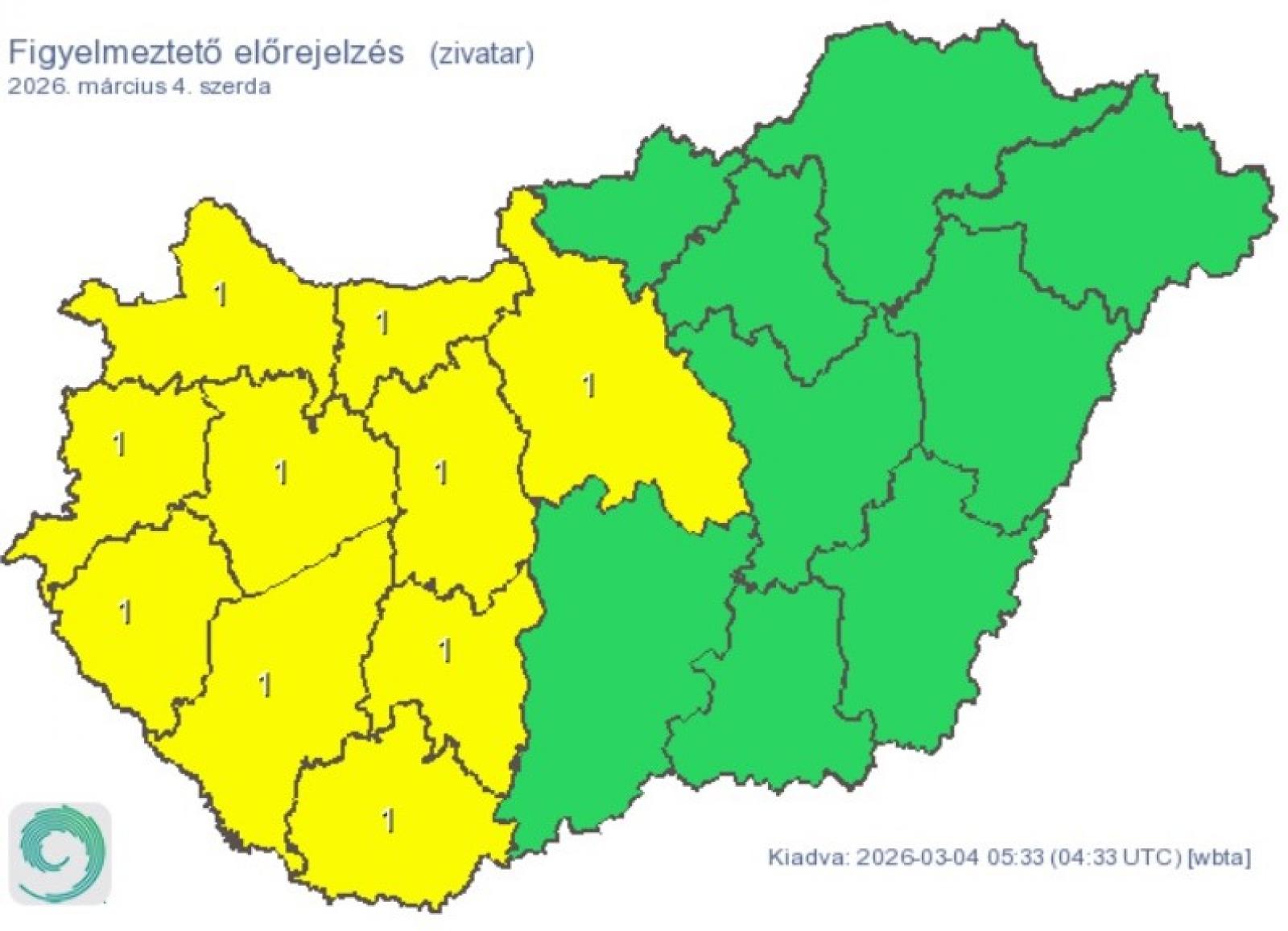 Tíz megyére (Pest, Baranya, Fejér, Győr-Moson-Sopron, Komárom-Esztergom, Somogy, Tolna, Vas, Veszprém és Zala) elsőfokú figyelmeztetést adtak ki szerdára a várható zivatarok miatt.