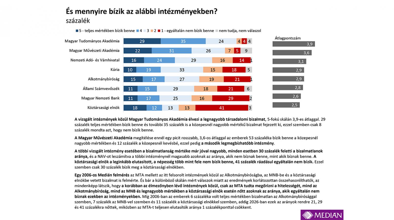 A felmérés szerint a társadalom az MTA-ban és a tudósokban bízik a legjobban, az 5 fokú skálán 3,9-es átlaggal. A második helyen a Magyar Művészeti Akadémia végzett 3,6-os átlagpontszámmal. Az Adóhivatal (3,1 pont), a Kúria (2,9 pont) és az Alkotmánybíróság (2,9 pont) a középmezőnyben foglal helyet. A köztársasági elnök mellett a Magyar Nemzeti Bank (2,6 pont) és az Állami Számvevőszék (2,8 pont) a legelutasítottabb.