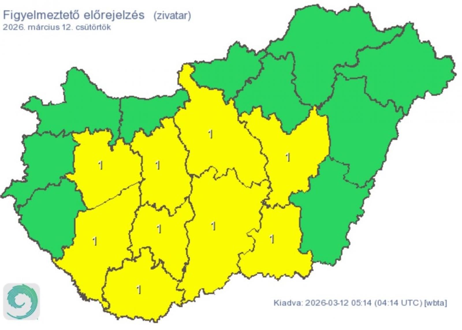 Kilenc vármegyére (Pest, Baranya, Bács-Kiskun, Csongrád-Csanád, Fejér, Somogy, Jász-Nagykun-Szolnok, Tolna és Veszprém) elsőfokú figyelmeztetést adtak ki a zivatarok miatt csütörtökre.