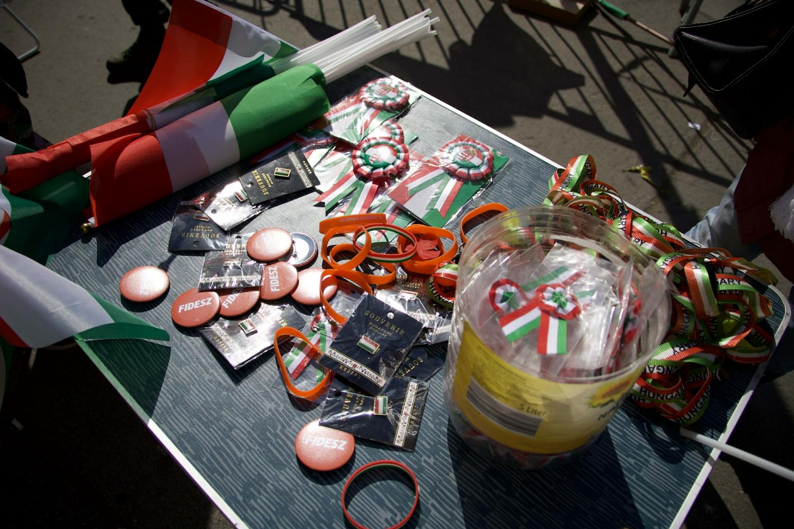 Árulnak Orbán Viktorral díszített kokárdát is 2000 forintért, de a 24 járt olyan sátorban, ahol 6700 forintért a mikrofonos Lázár János-bábu, a DPK-shopban pedig a hírhedt Orbán-féle krikszkraksszal nyomott pólót és pulóvert adnak.