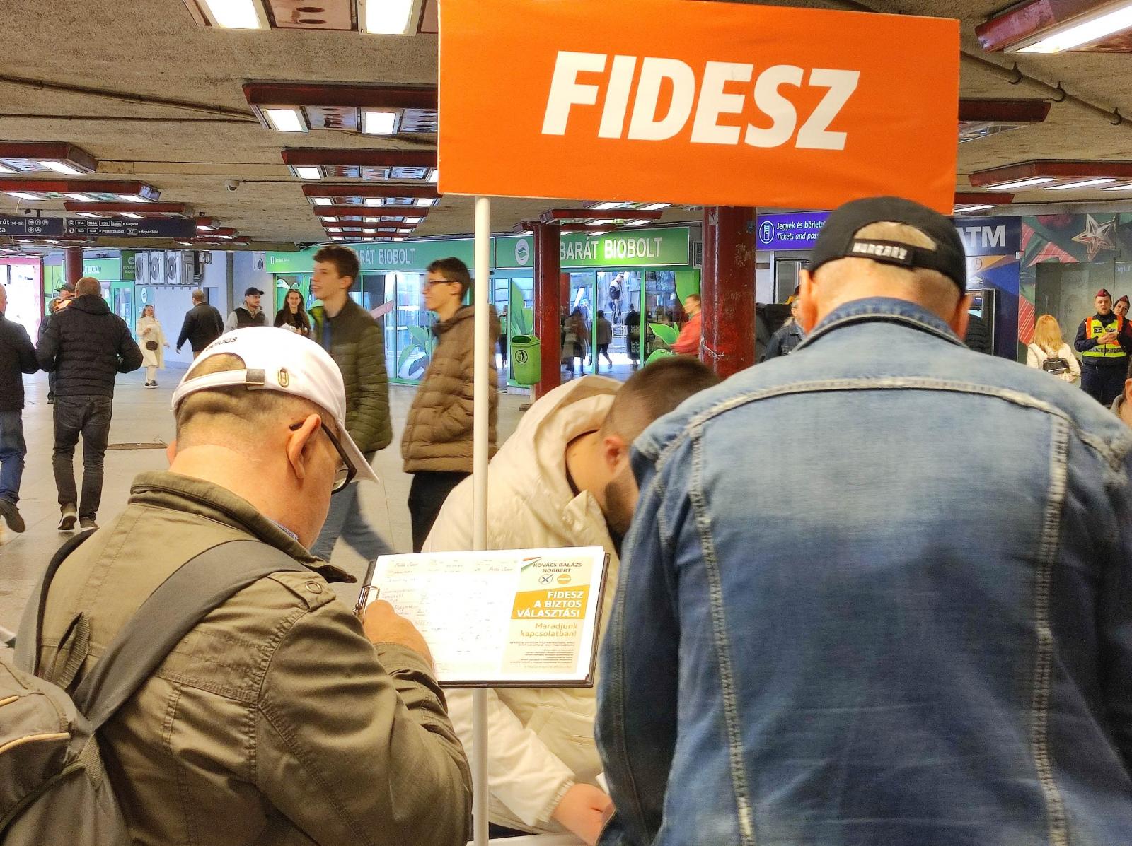 A Nyugati téren többen várakoznak, hogy csatlakozzanak, a Békemenethez, amely lassan ideér. Fideszesek pultoznak, láthatóan kapcsolattartás céljából gyűjtik a választók adatait.