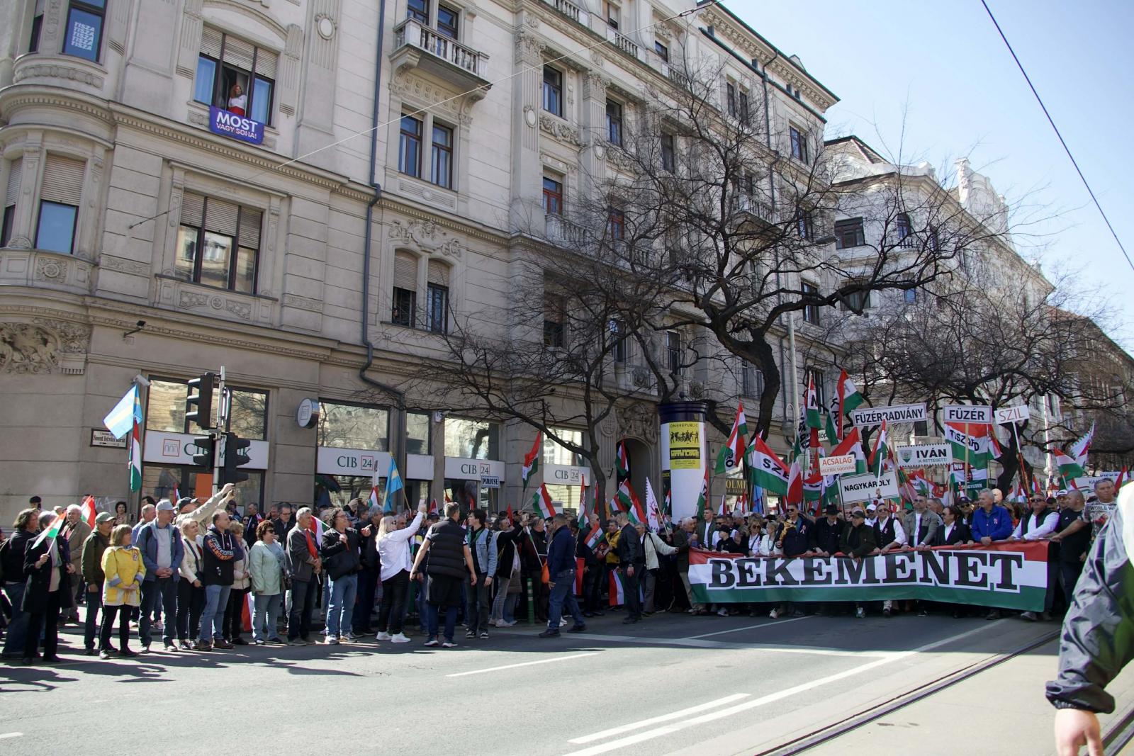 A menet a Vígszínháznál jár. Hogy honnan jön a füst, az nem világos. Ria, ria, Hungária – skandálja a tömeg.