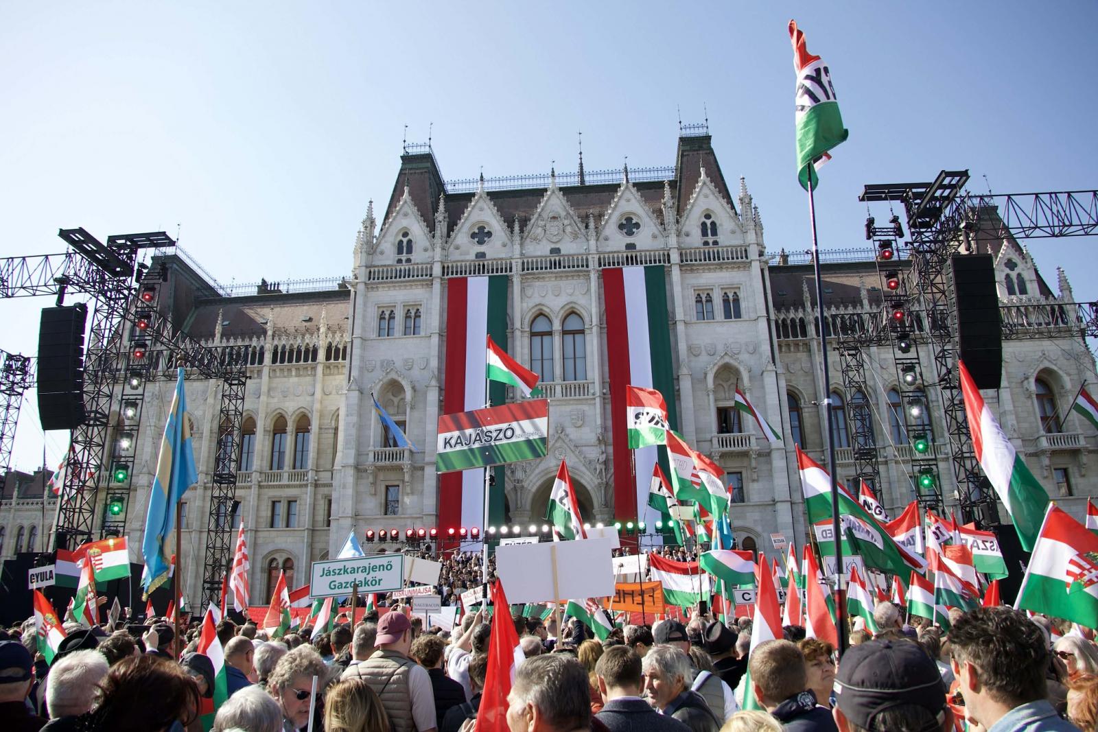 A terület középső rész kordonnal el van zárva, hogy legyen hely, de kordonon kívüli részét is megtölti az Orbán-beszédet váró tömeg. Az ünnepi műsor még nem kezdődött el, a menet vége a Nyugati téren tart. Itt egy kép.