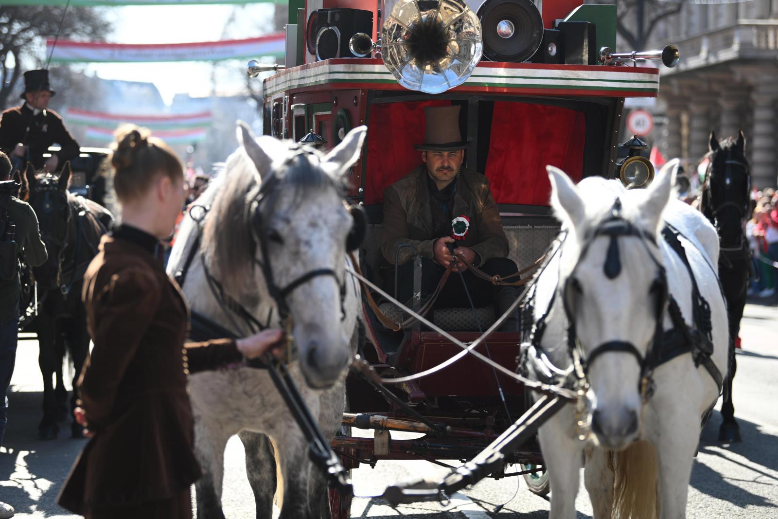 Vonulás közben a Nagymező utcánál hintók, az Oktogonnál lovon huszárok csatlakoznak a Nemzeti Menethez. Az úton szakaszonként kivetítők sorakoznak.