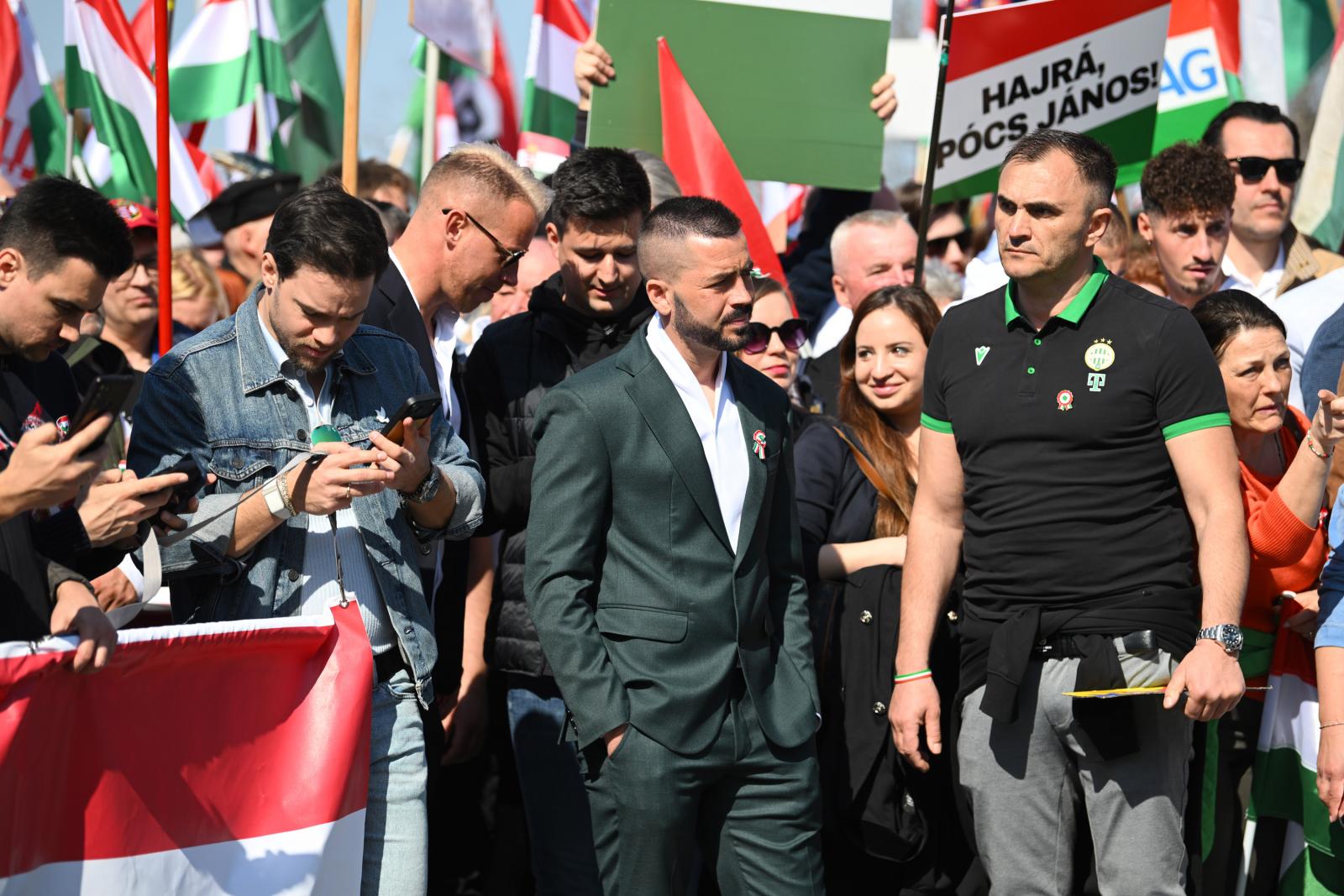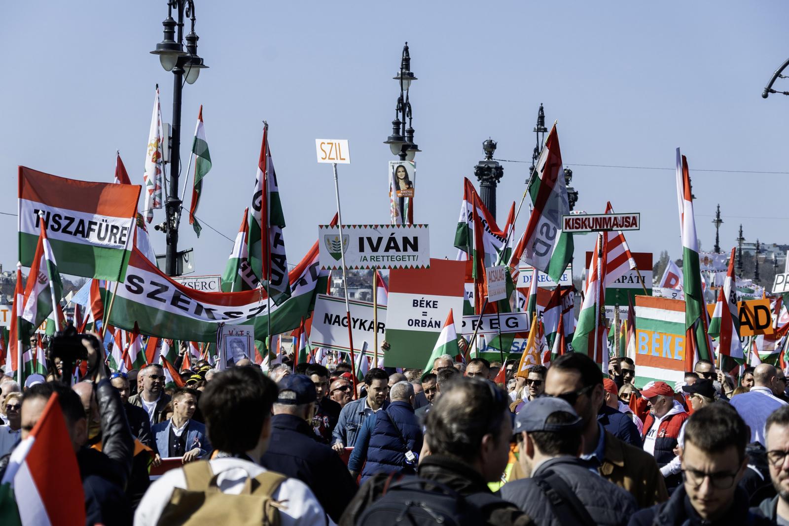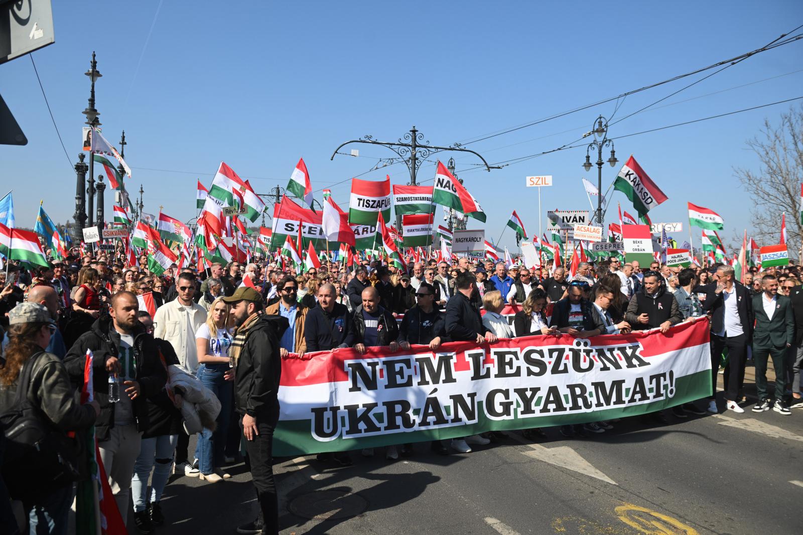 A tömeg – jó néhány tízezren lehettek – vidámnak és lelkesnek tűnt. A szervezők többféle táblát osztogattak. Az egyik azt hirdette, hogy „Zelenszkij rabjai nem leszünk!”, a másik azt, hogy „A Fidesz a biztos választás”. A harmadikon Magyar Péter és Volodimir Zelenszkij áthúzott fényképe mellett az állt, hogy „Stop háború!”, a negyediken szintén áthúzva cirill betűkkel és ukrán nemzeti színekkel szerepelt a Tisza.
