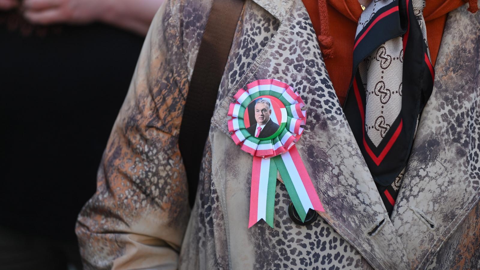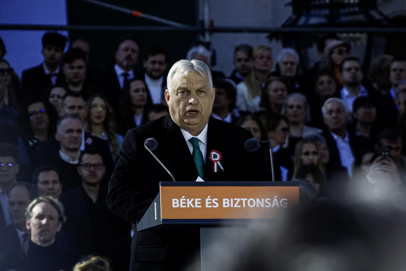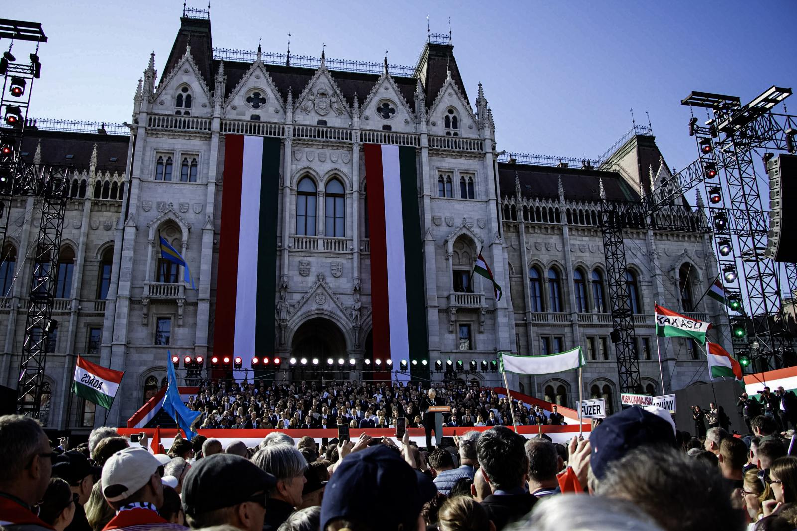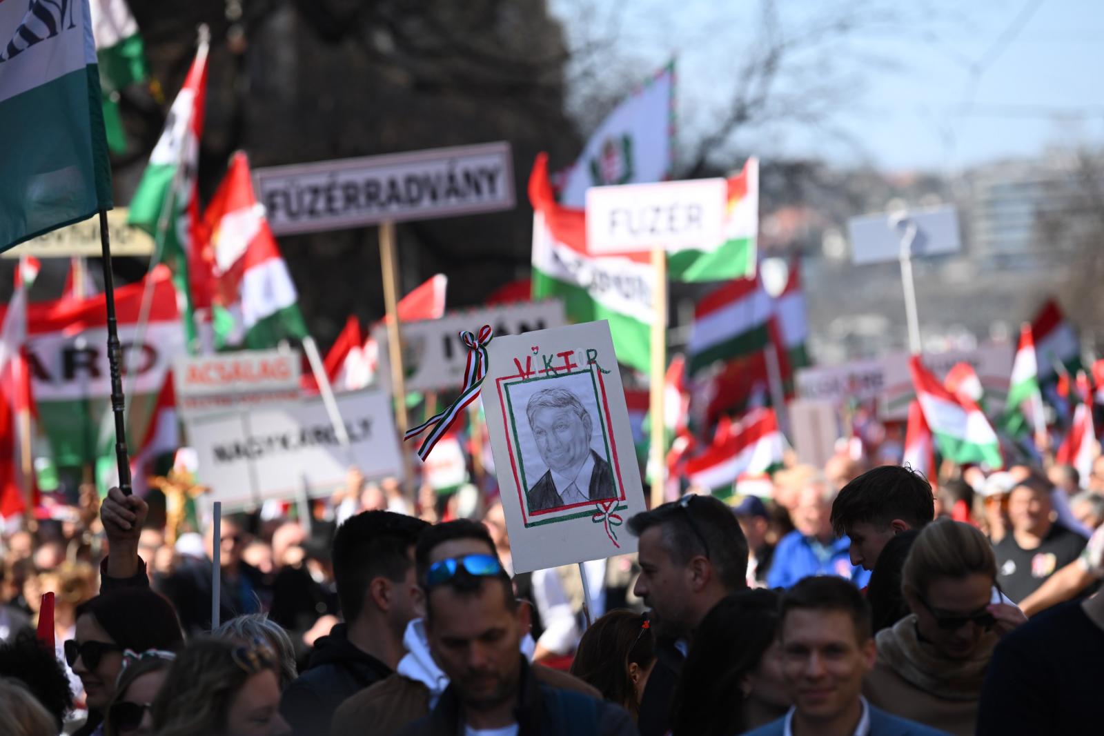 A tömeg – jó néhány tízezren lehettek – vidámnak és lelkesnek tűnt. A szervezők többféle táblát osztogattak. Az egyik azt hirdette, hogy „Zelenszkij rabjai nem leszünk!”, a másik azt, hogy „A Fidesz a biztos választás”. A harmadikon Magyar Péter és Volodimir Zelenszkij áthúzott fényképe mellett az állt, hogy „Stop háború!”, a negyediken szintén áthúzva cirill betűkkel és ukrán nemzeti színekkel szerepelt a Tisza.