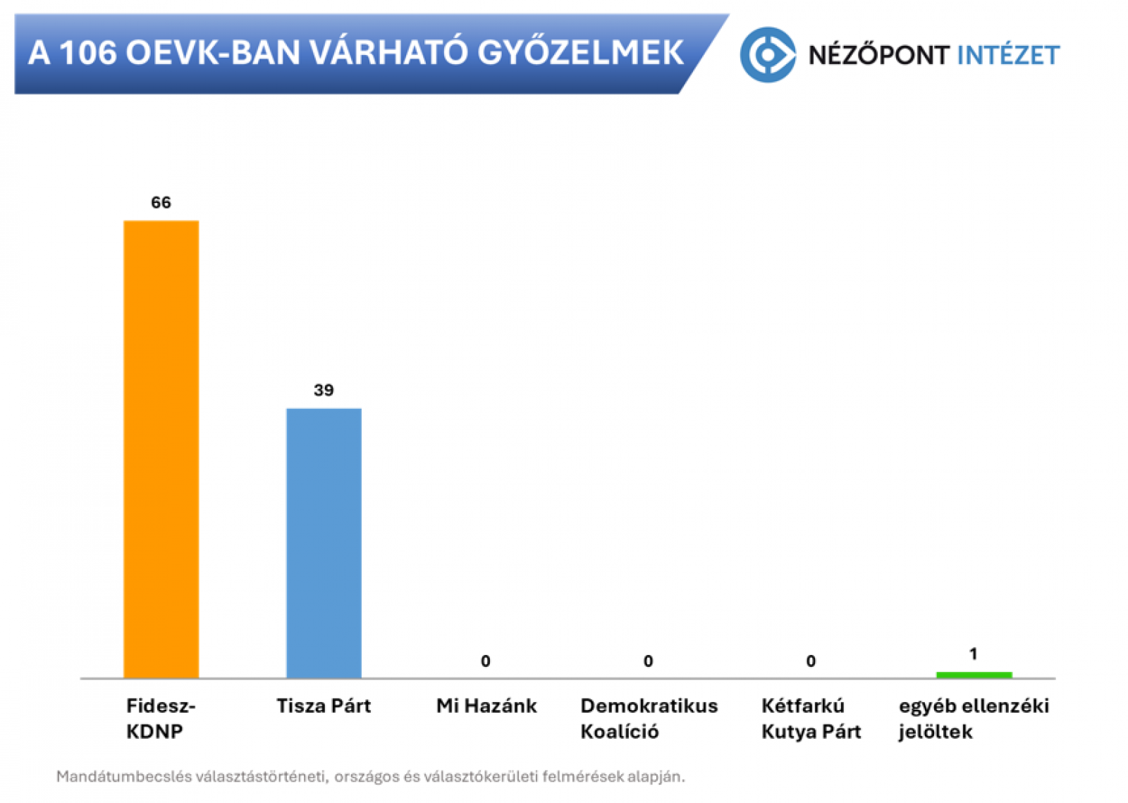 A fennmaradó 35 választókerület közül 22-ben nagy valószínűséggel a kormánypártok jelöltjei győzhetnek, míg 13-ban várhatóan a Tisza jelöltjei végeznek az első helyen. Összesítésben a Fidesz-KDNP 66, a Tisza Párt 39 választókerületben számíthat jelöltje sikerére, további egy körzetben pedig egy Tisza-közeli ellenzéki jelölt lehet az első. A Mi Hazánk, a Demokratikus Koalíció (DK), a Kétfarkú Kutyapárt jelöltjeinek, illetve más, itt nem említett független indulóknak az egyéni választókerületekben való győzelme nem tűnik reálisnak.