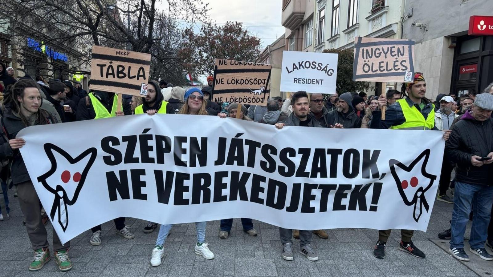 Több tucat tüntető gyűlt össze Szombathelyen csütörtökön, Orbán Viktor országjárásának helyszínén. A tüntetők végig fújoltak, „mocskos fideszeztek”, „ruszkik hazázással”, sípolással követték a miniszterelnök beszédét – írja a Telex helyszíni tudósításában, kiemelve, hogy a tüntetőket és az Orbán országjárásáról jól ismert, Fidesz-szimpatizáns keménymagot egy valtonos sor választotta el egymástól. Az ellentüntetők között felsorakozott a Magyar Kétfarkú Kutya Párt is egy molinóval, rajta egy felirat: Szépen játsszatok, ne verekedjetek! Sípolásukra, kiabálásukra halkabb „ria, ria, Hungária” és „hajrá Fidesz” felkiáltás érkezett a másik oldalról.