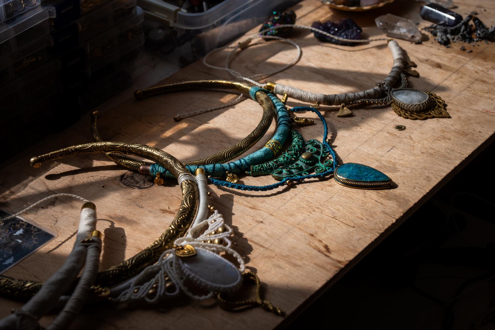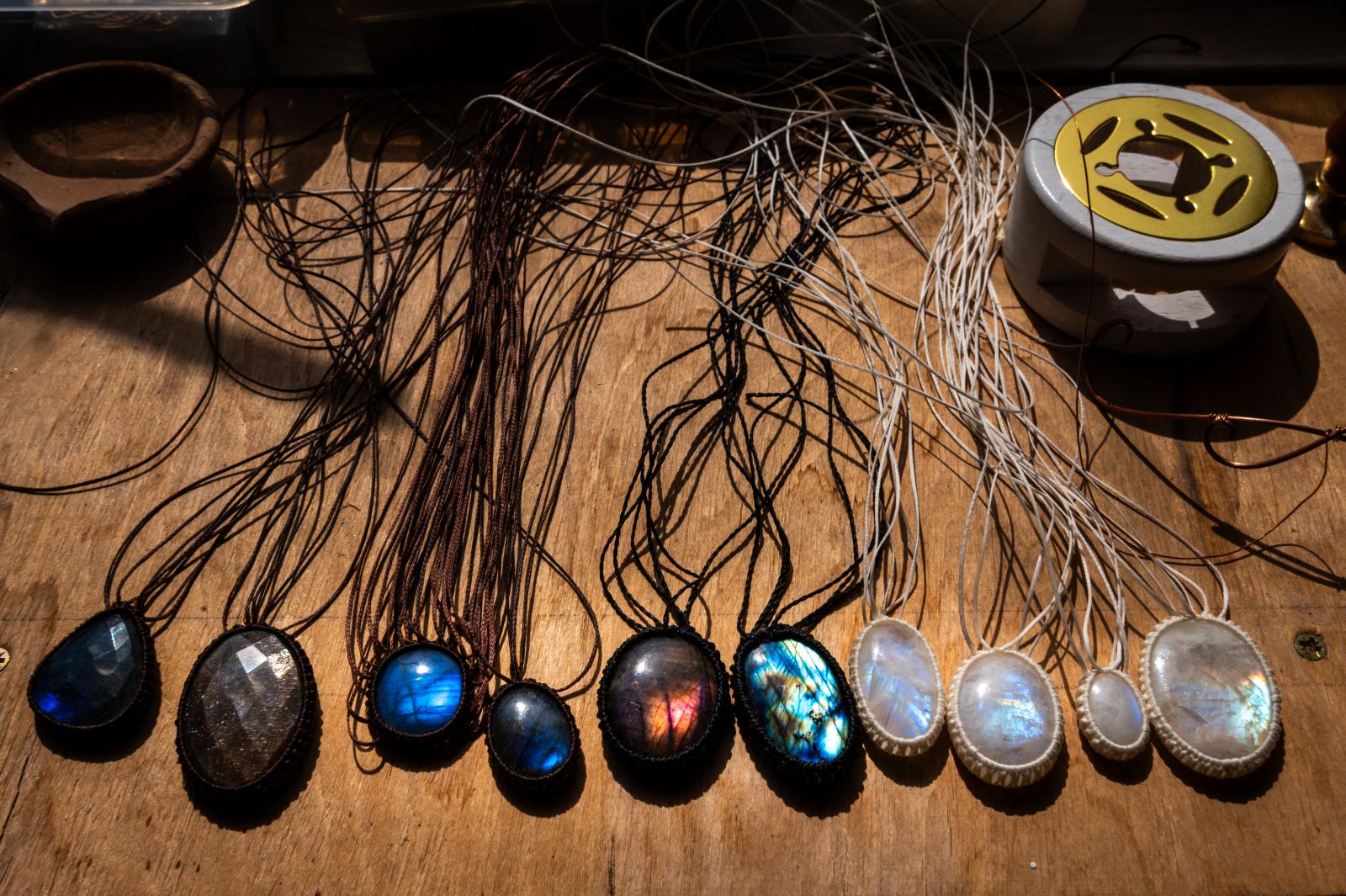 Cecília az ékszerekhez nem használ üveget, csakis bronzot, rezet és fél­drágaköveket. Végig is mutatja nekünk gyűjteményét: van itt achát, holdkő, rózsakvarc, kianit, apatit, aurakvarc, rutilkvarc, rubin, fekete obszidián, zöld gránát, azurit és pávaszem kagyló is. Míg ő a kőtípust választja ki, az egyes kövek saját energiáját már a viselő érzi meg. Segít ráhangolódni, de ezután hagyja, hadd szólítsa meg őket a kő. A legutóbbi vásáron odament hozzá egy anyuka a gyermekével, akinek volt egy komolyabb kibillenése, amivel már orvosnál, pszichológusnál is jártak. Ahogy Cili fogalmaz, valami nagyon elfújta őt a lelkéből, és kellett egy kő, ami visszaerősíti.